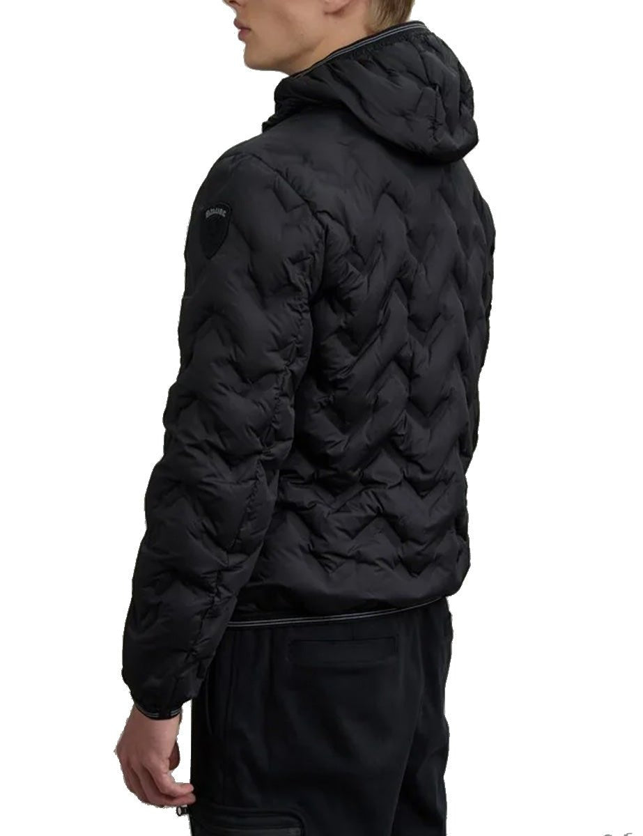 Piumino in nylon nero con impunture nastrate, chiusura frontale con zip in tono. Cappuccio fisso, copri cursore sul collo, tasche con zip e finiture cappuccio, polsi e fondo con elastico rigato. Patch portalogo sulla manica sinistra e passante con logo al petto. Interno a contrasto color tabacco, tasche interne con velcro.