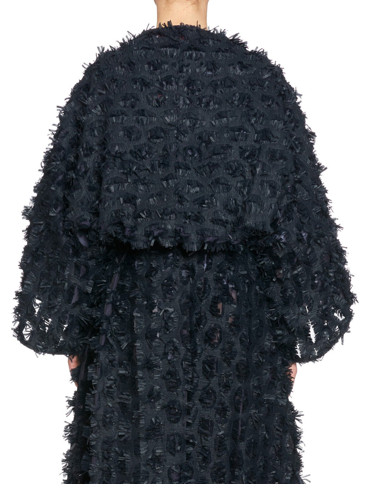 Coprispalle in tessuto fantasia sfrangiato color blu oltremare, manica ampia e volume rimborsato.