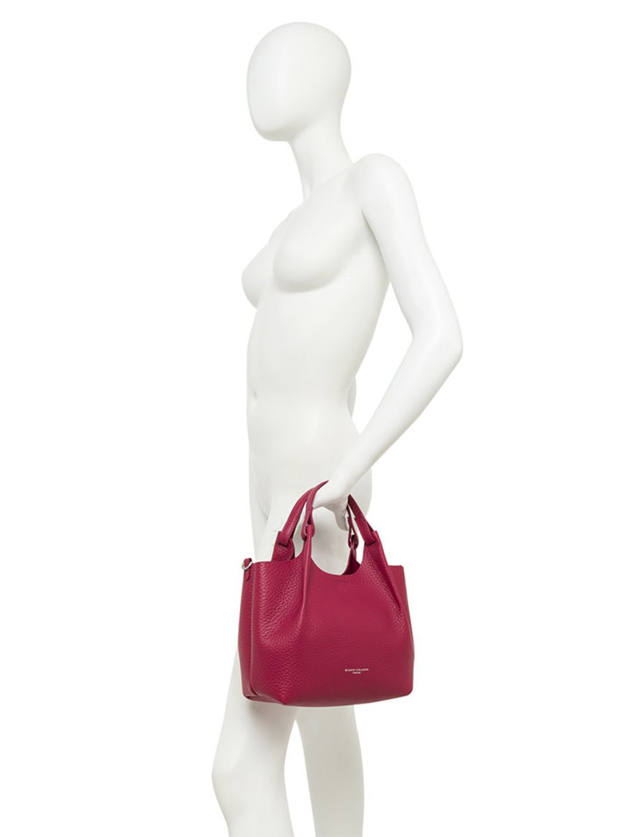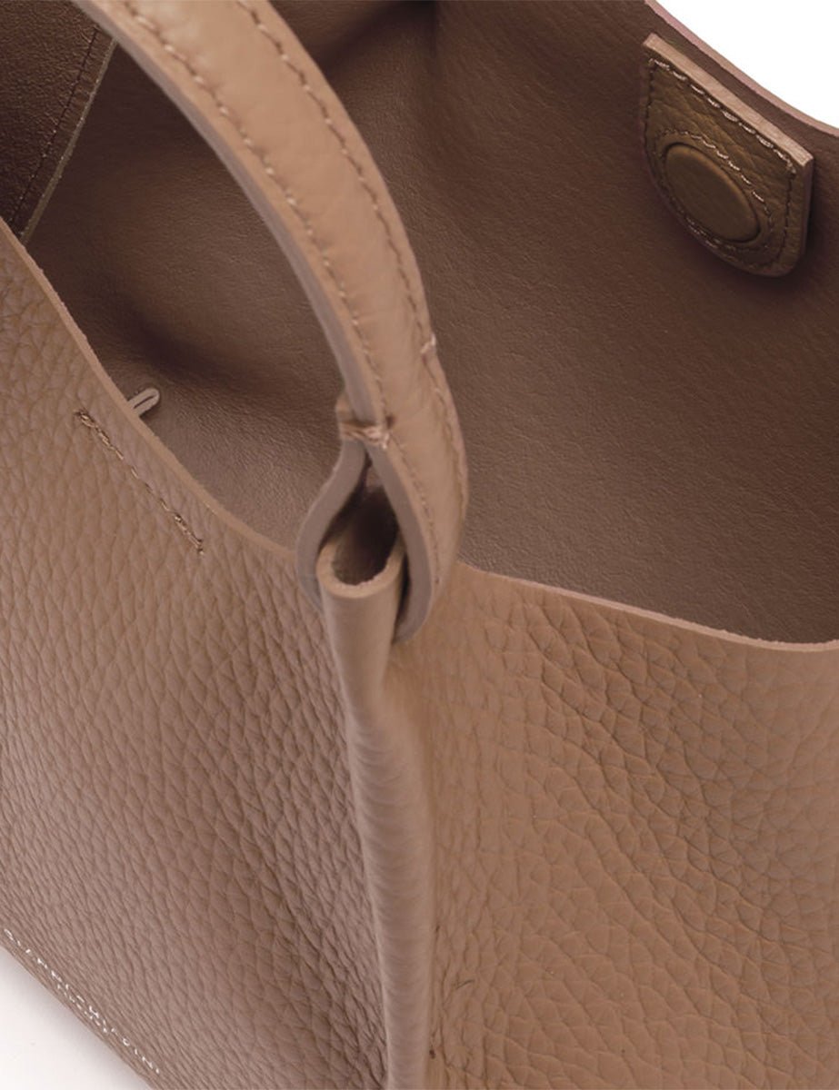 Realizzata in pelle double grana maxi color cammello, questa borsa presenta un dettaglio di manici in tono e pinces che definiscono il volume, chiusura magnetica. Da portare a mano o con la tracolla regolabile e rimovibile.