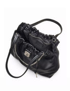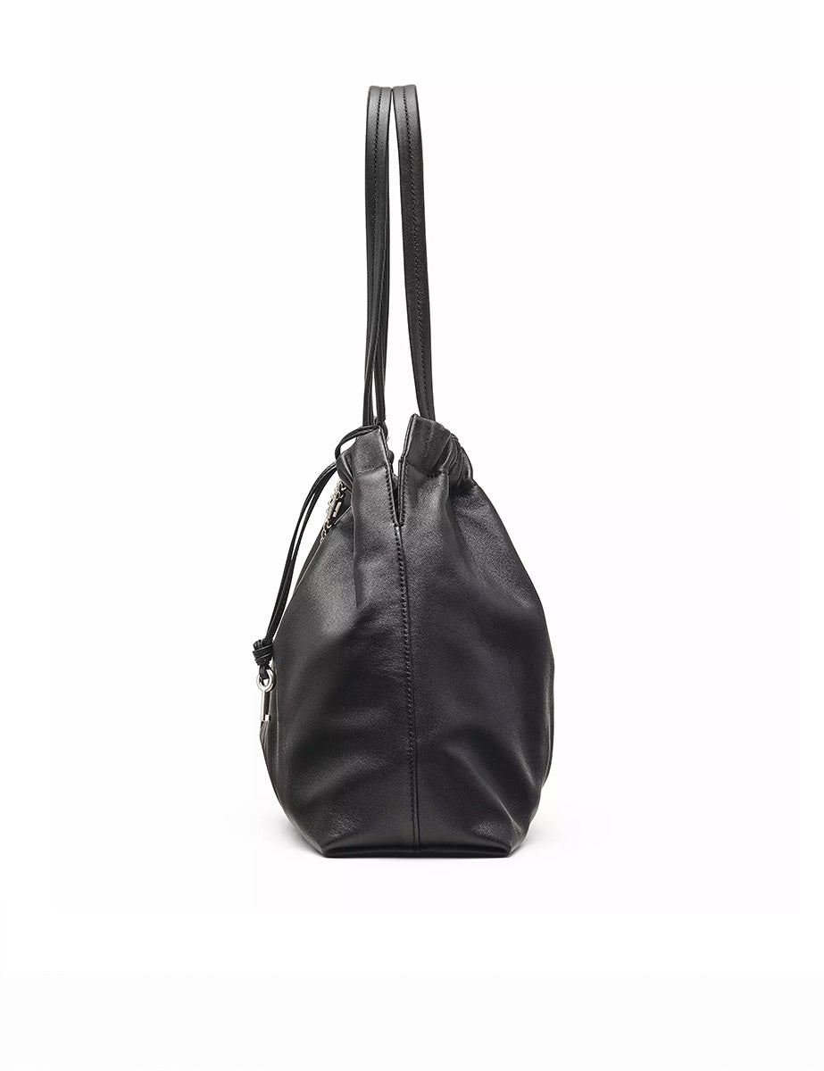 Realizzata in morbida nappa nera, questa borsa presenta una chiusura superiore con snap magnetico e motivo coulisse, due pratici manici superiori e un lucchetto decorativo porta logo.