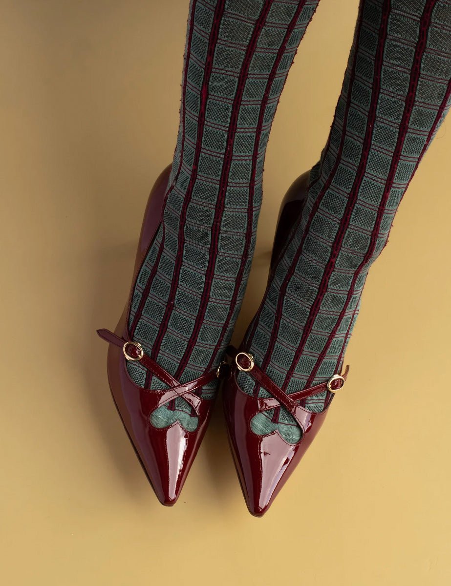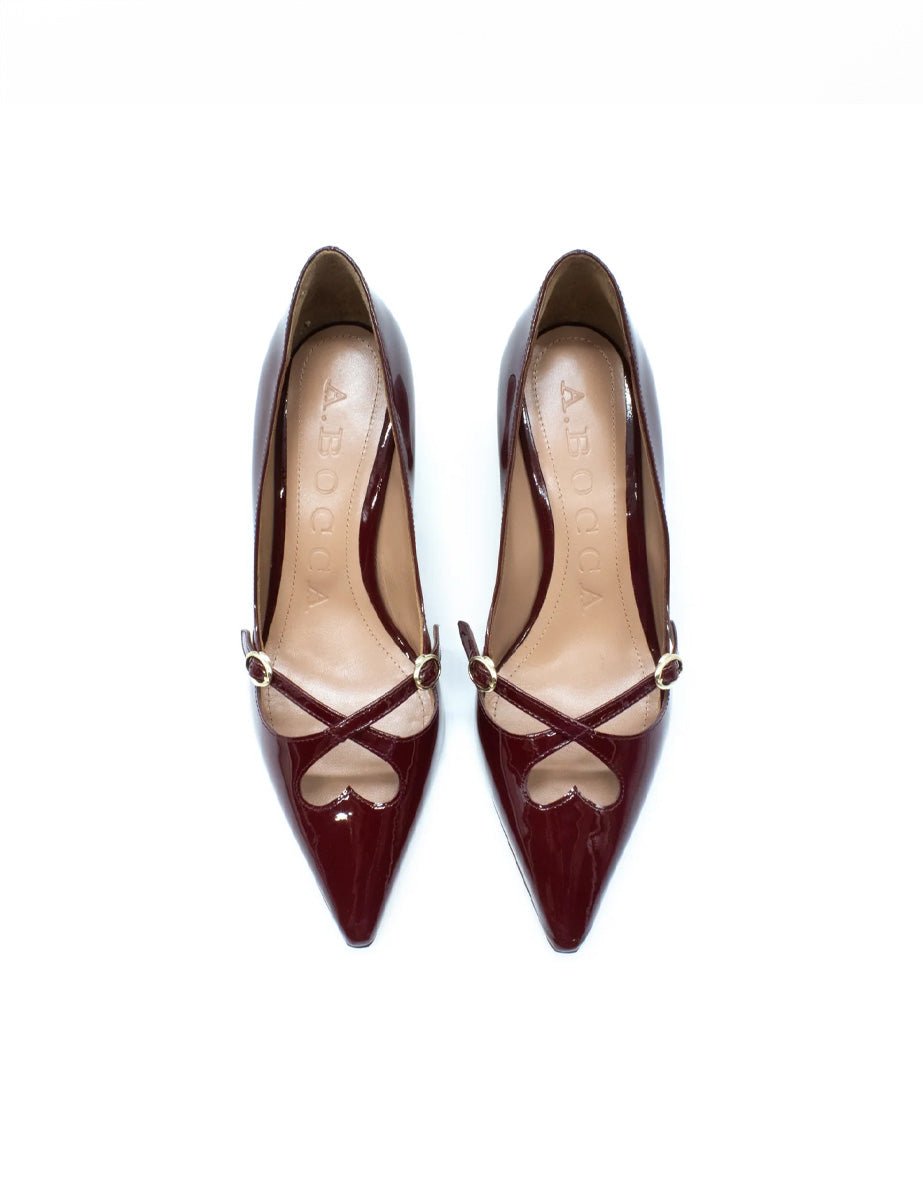 Décolleté a punta in pelle verniciata color bordeaux, doppio cinturino con incrocio su scollo a cuore e tacco basso.