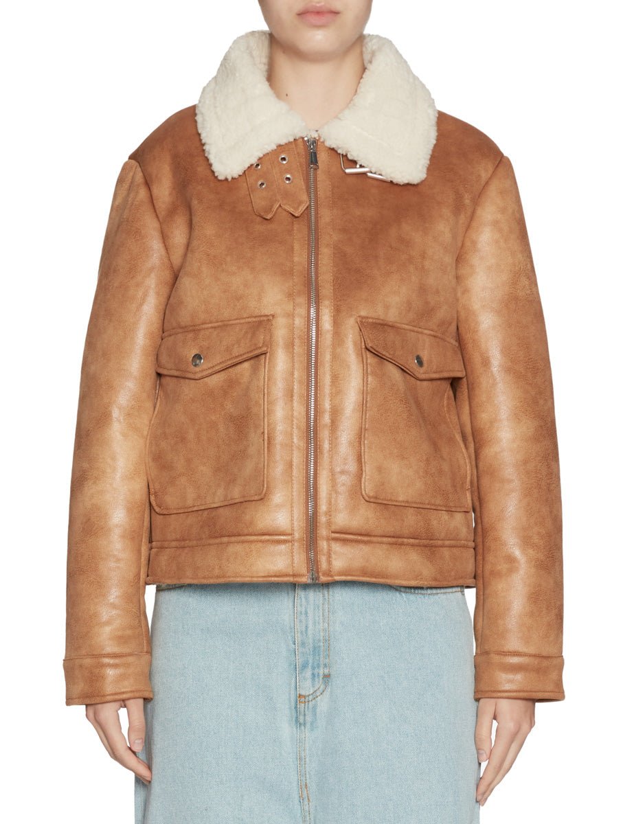 Ecomontone effetto vintage color biscotto con pelo a contrasto color crema, chiusura zip frontale metallica e tasche a patta frontali con aletta e chiusura a snap con ingresso tasca laterale. Chiusura collo con doppia fibbia, polsi e fondo finiti con orlo rimesso e spalla leggermente scesa. Volume boxy, chiusura polsi con snap a vista.