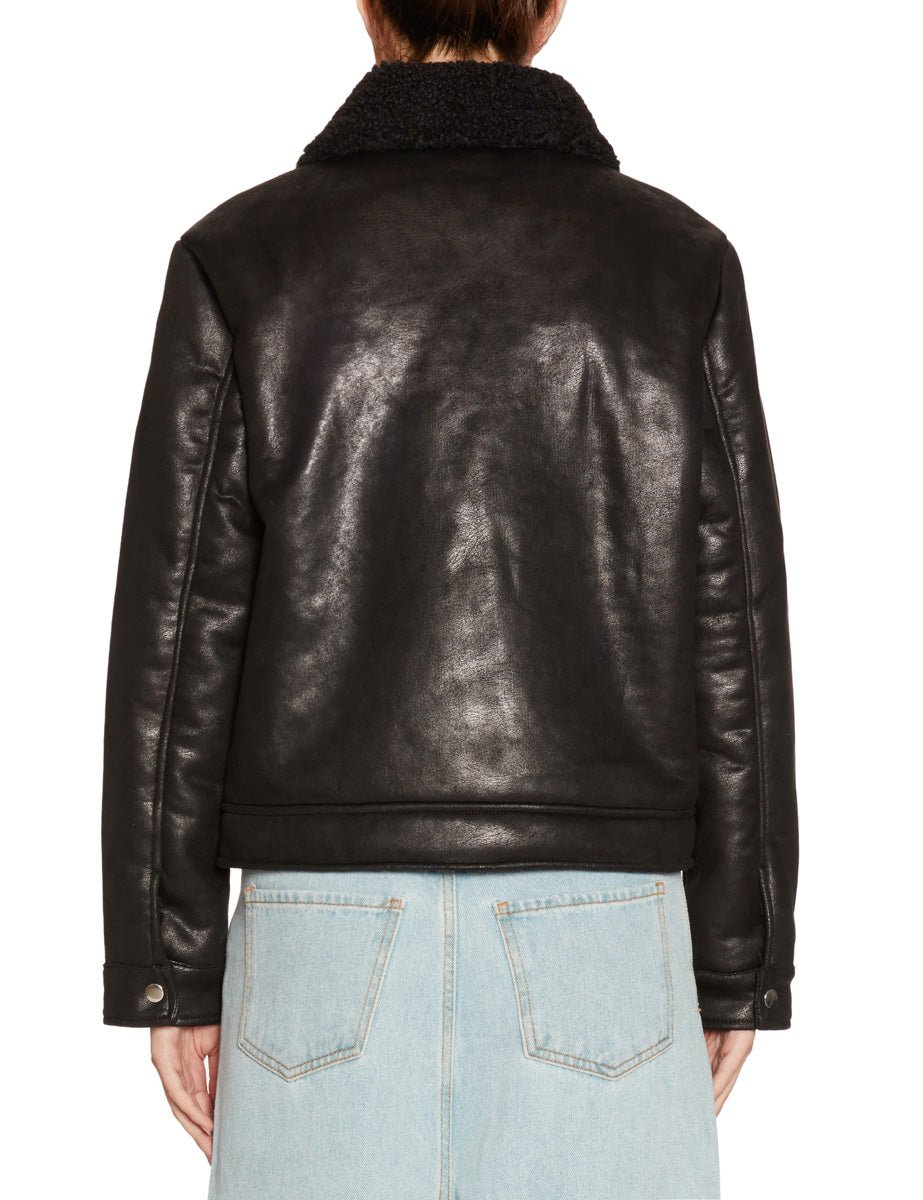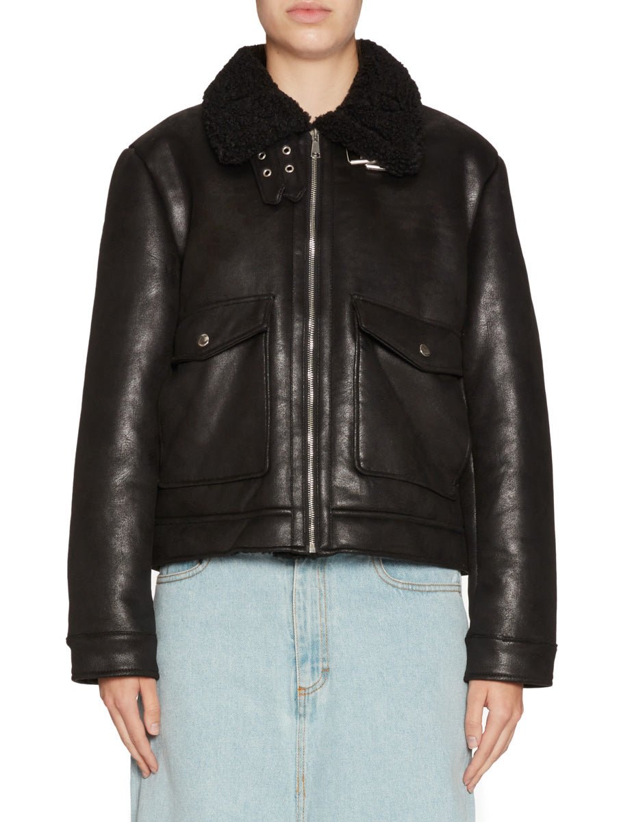 Ecomontone effetto spalmato crinkle color nero con pelo in tono, chiusura zip frontale metallica e tasche a patta frontali con aletta e chiusura a snap con ingresso tasca laterale. Chiusura collo con doppia fibbia, polsi e fondo finiti con orlo rimesso e spalla leggermente scesa. Volume boxy, chiusura polsi con snap a vista.
