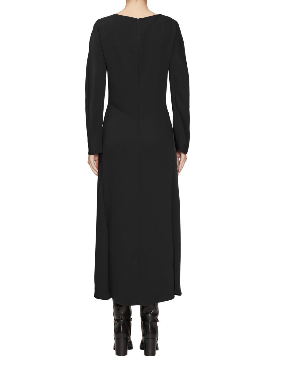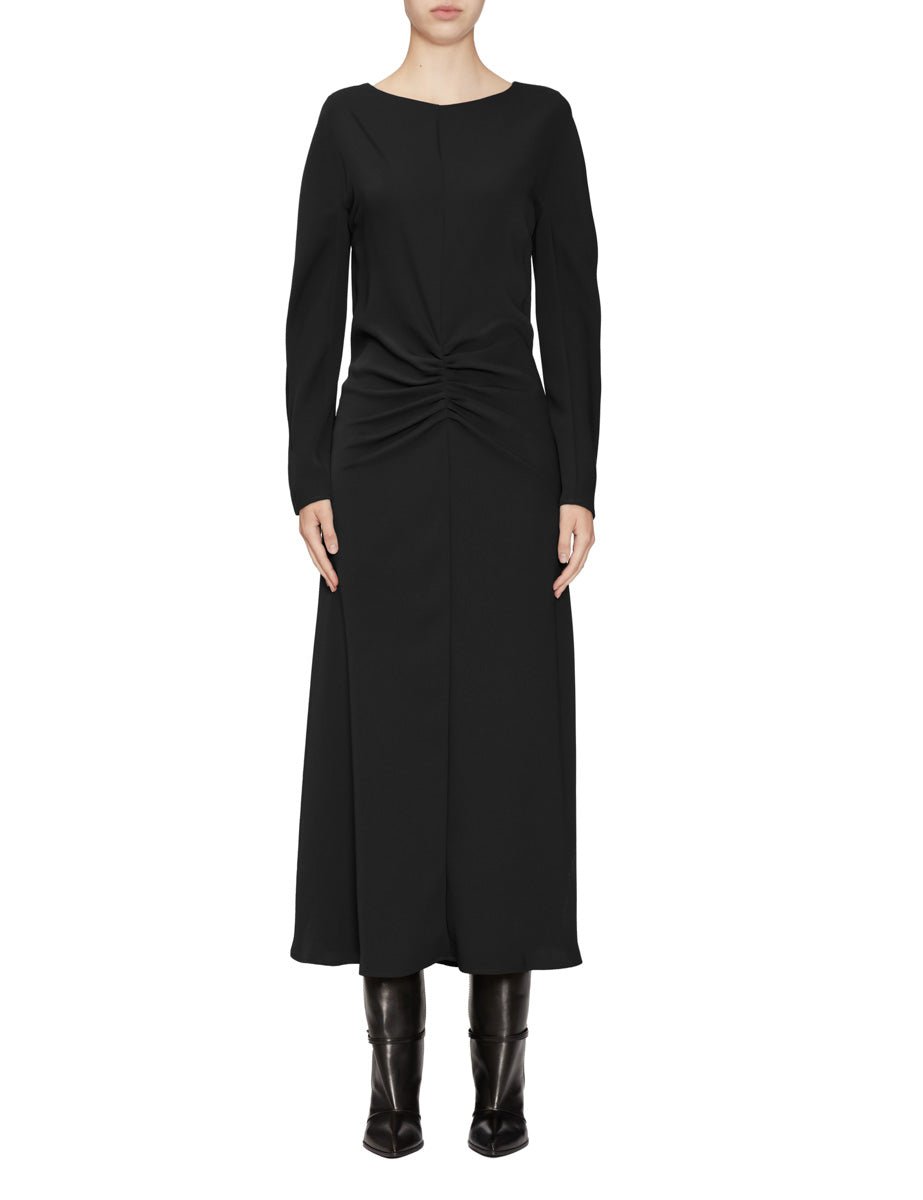 Abito midi in tessuto tecnico color nero, scollo a barchetta e chiusura co0n zip invisibile nel centro dietro. Arriccio frontale posizionato all'altezza della vita, manica lunga e gonna svasata.