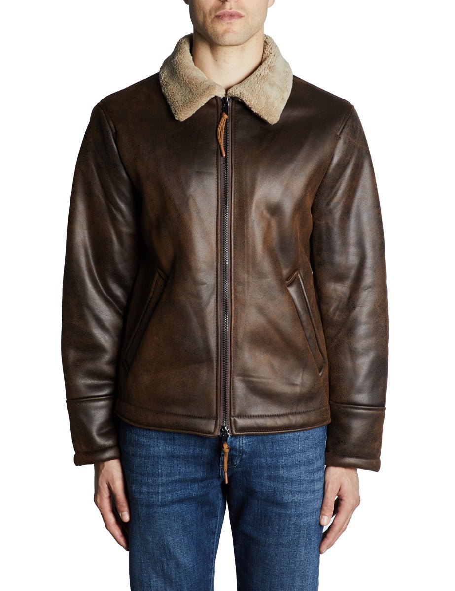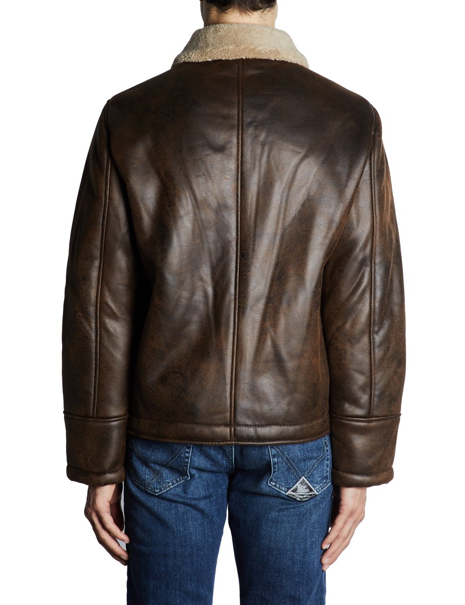 Ecomontone effetto vintage color tabacco con pelo in contrasto color crema, chiusura frontale con zip metallica e doppio cursore con tirazip in ecopelle. Tasche a filetto trasversali, finitura polsi con borso rimesso.
