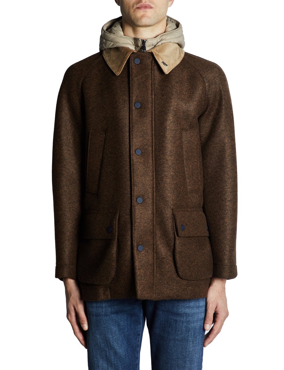 Giacca in panno pressato color cacao con, internamente, davantino con cappuccio in nylon imbottito color beige. Chiusura frontale con bottoncini a pressione color blu opaco, doppie tasche frontali a filetto frontali e a toppa con chiusura a patta. Colletto a camicia in velluto a coste beige, spalla raglan e doppio spacco nel fondo dietro con chiusura con snap.