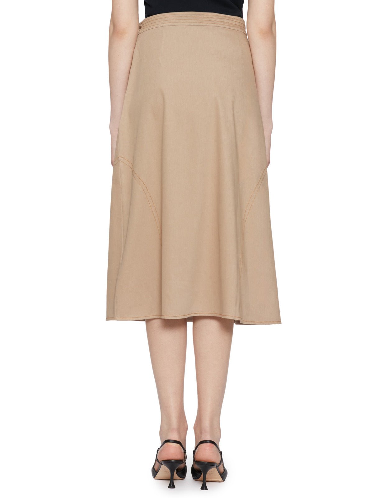 Gonna in denim bull stretch color beige, linea svasata e chiusura a portafoglio. Impunture a contrasto color tabacco e motivo cintura annodabile al fianco.