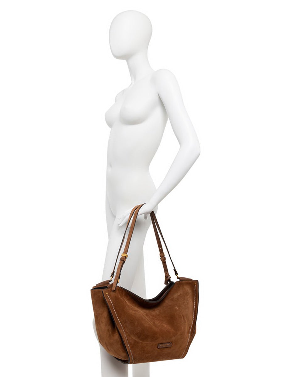 Borsa caratterizzata da una linea a tulipano e realizzata in pelle scamosciata color caffè. Presenta una chiusura superiore con zip, due pratici manici superiori regolabili e impunture decorative a contrasto.
