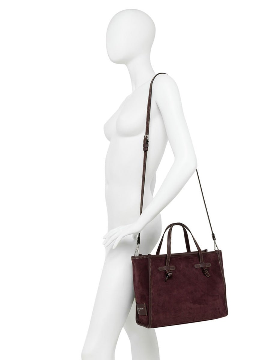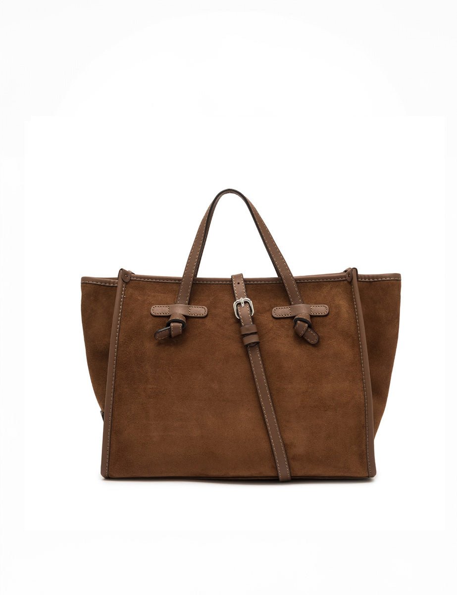 Borsa realizzata in pelle scamosciata color cognac, con finiture in pelle liscia in tono. Dotata di manici in pelle e di una tracolla regolabile e removibile.
