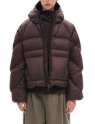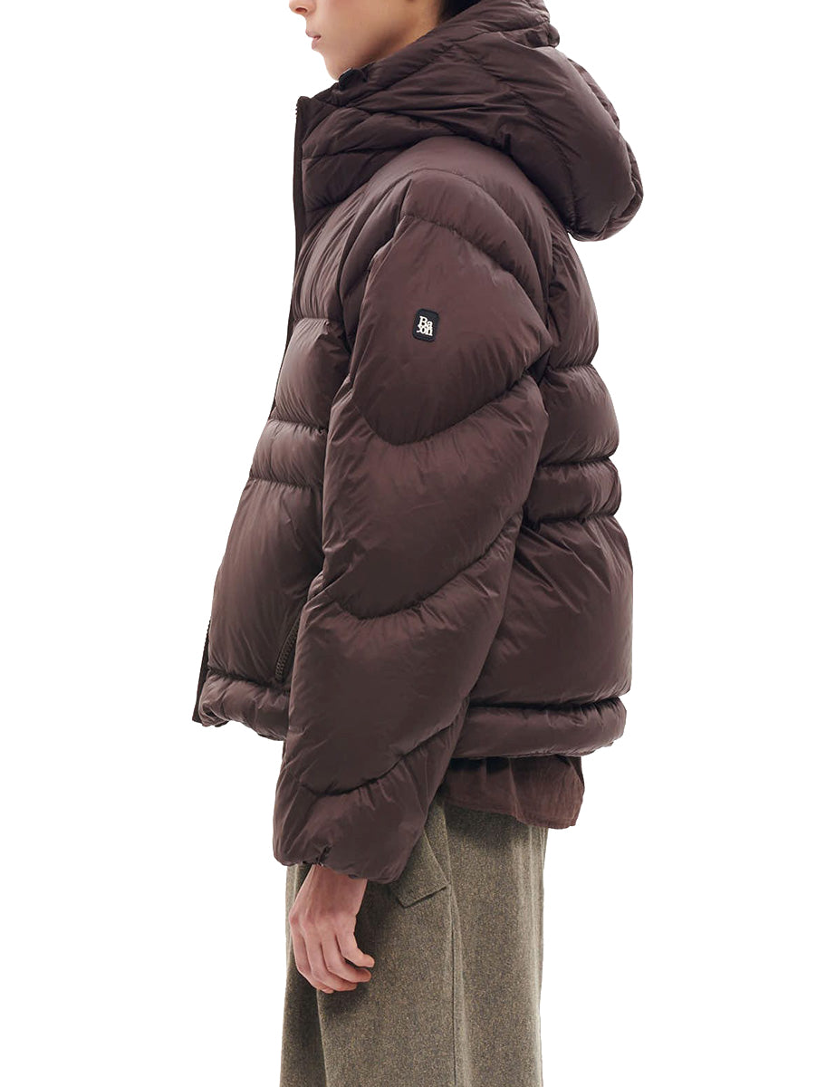 Piumino in tessuto eco-sostenibile FCS color cioccolato ed inserti teddy in tono, collo montante con cappuccio coulissato e chiusura frontale con zip in tono. Tasche con tessuto scaldamani interno, coulisse interna che chiude al fondo e polsi interni elastici. Sulla manica sinistra piccola toppa porta logo.