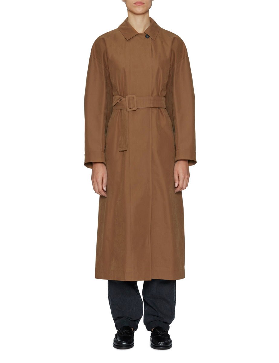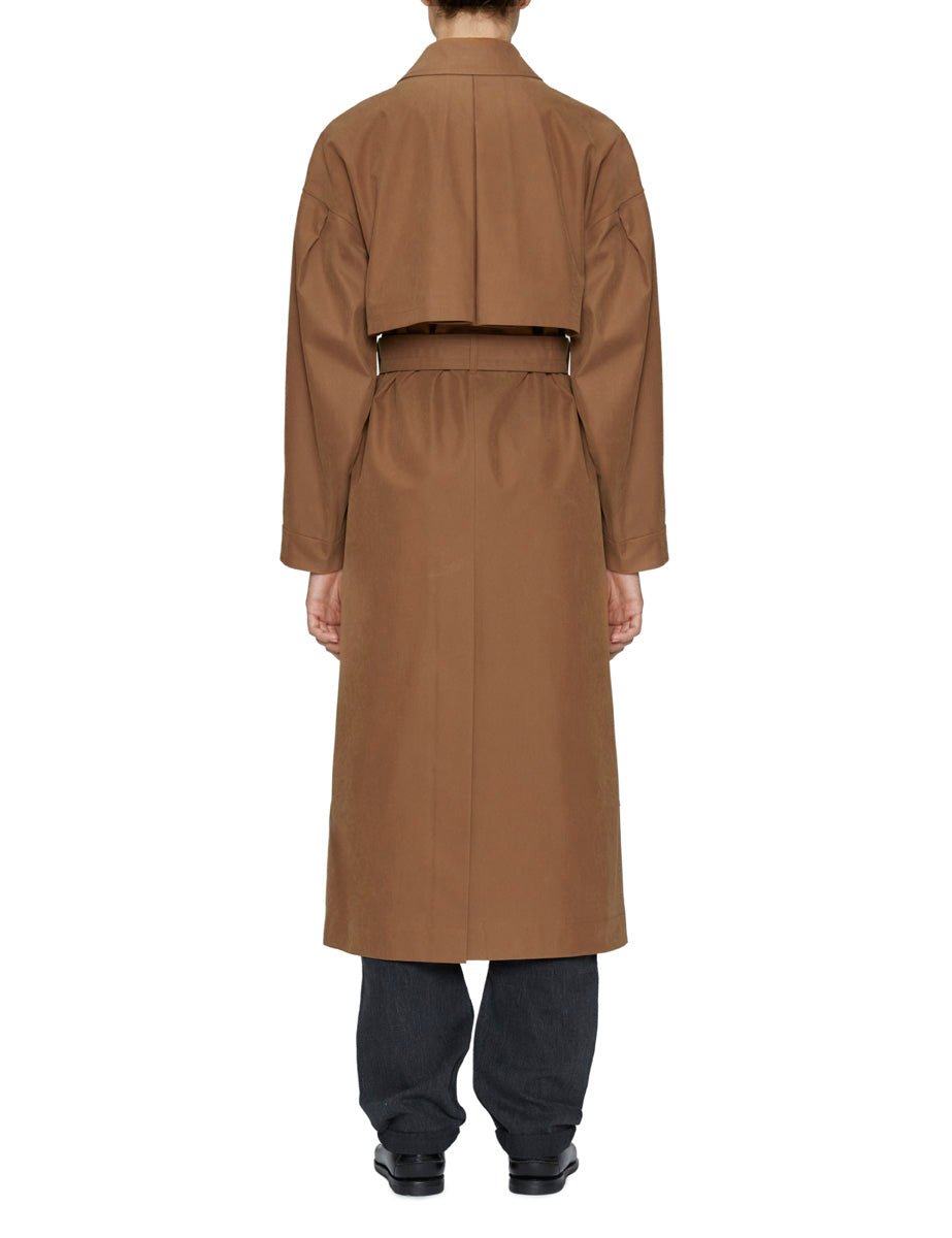 Trench in cotone tecnico color cammello, chiusura frontale a doppiopetto nascosta con bottoni e colletto a camicia. Volume ampio, spalla scesa e tasche a filetto frontali. Cintura impunturata in vita con fibbia ricoperta nello stesso tessuto, motivo mantellina con sfondo piega sulle spalle e profondo spacco nel centro dietro.