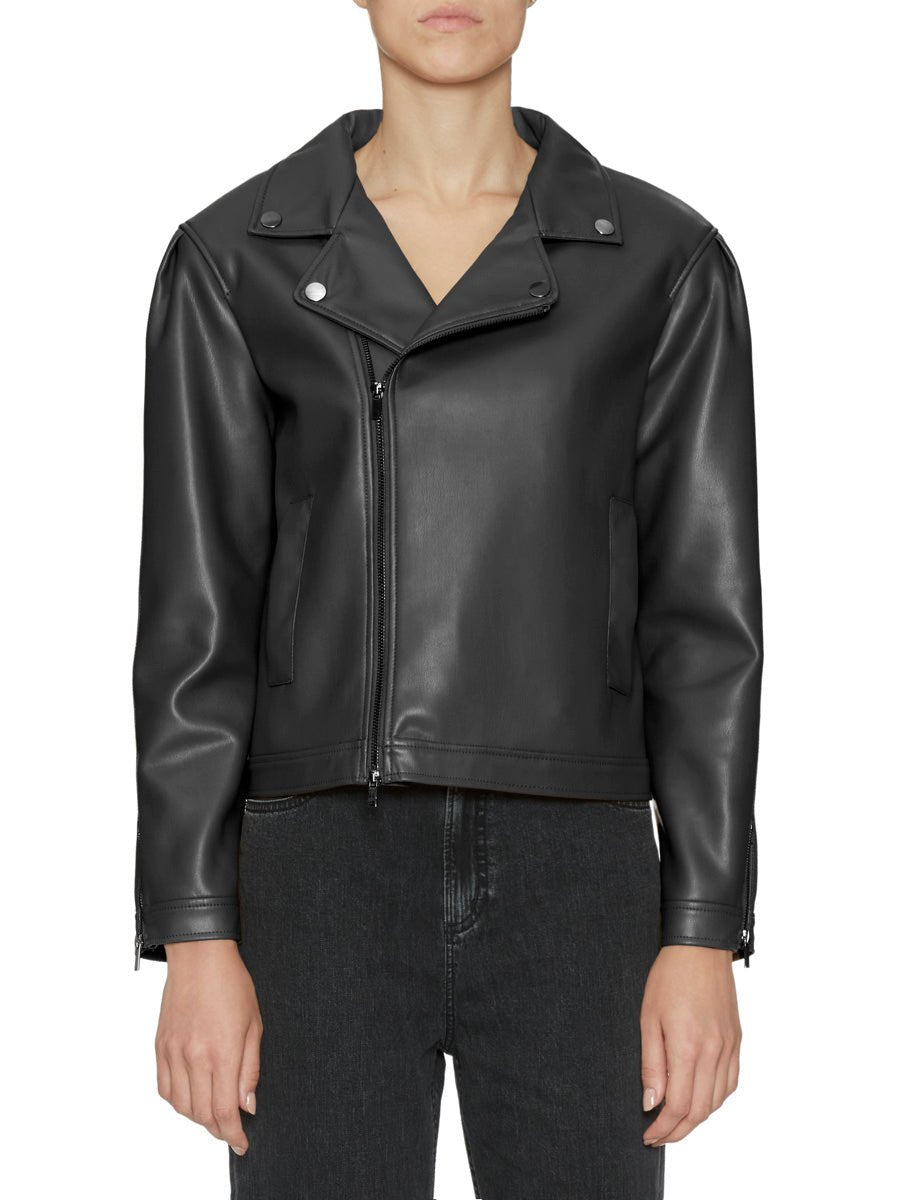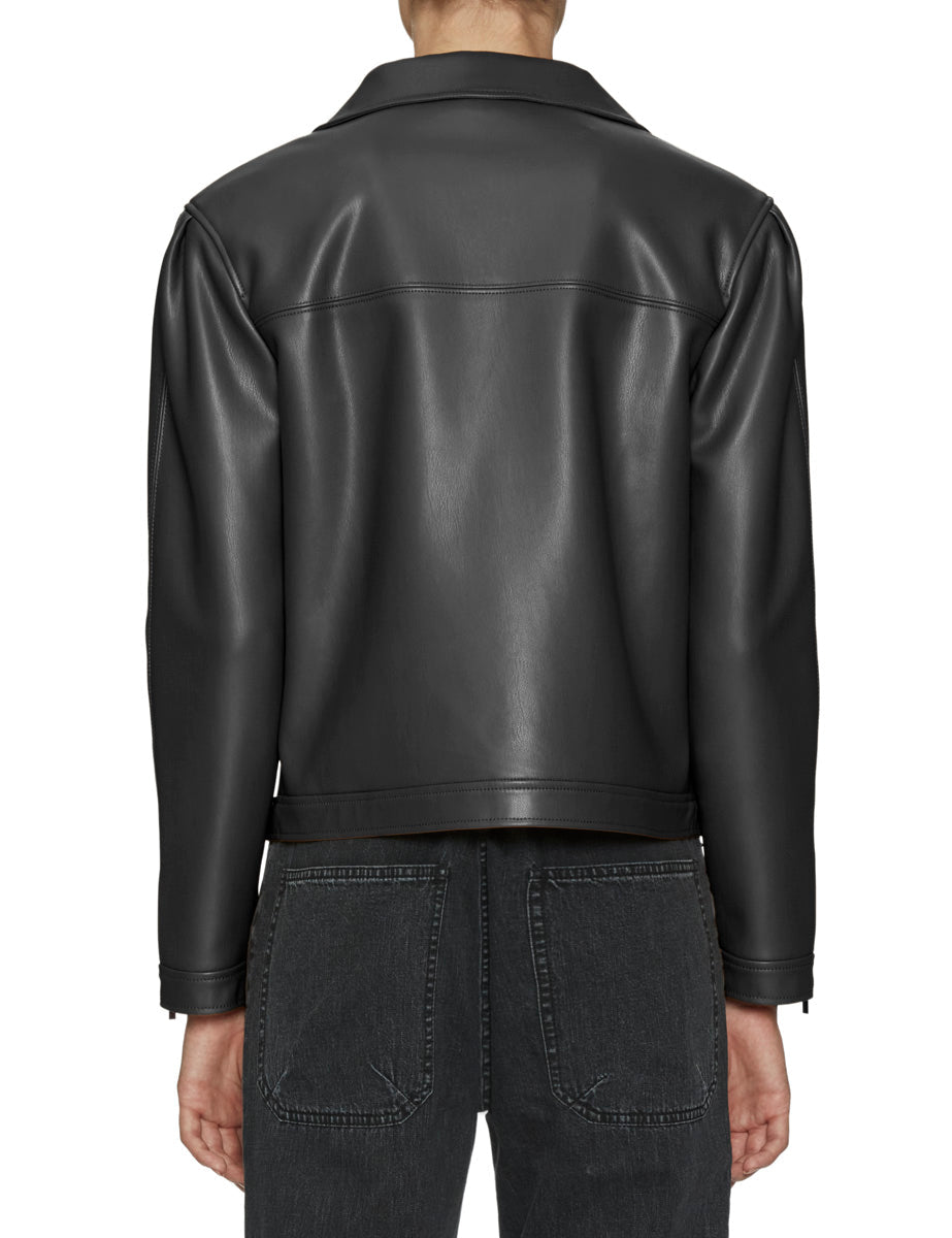 Biker in ecopelle color nero con chiusura con zip a doppio cursore e doppi snap nel collo revers. Tasche a filetto frontali, fondo e polsi rimessi, leggero arriccio nella manica all’altezza della spalla. Carrè alle spalle e chiusura polsi con zip.