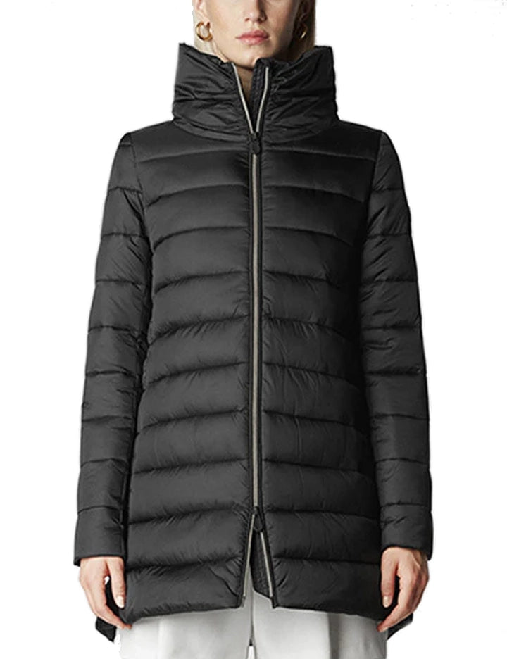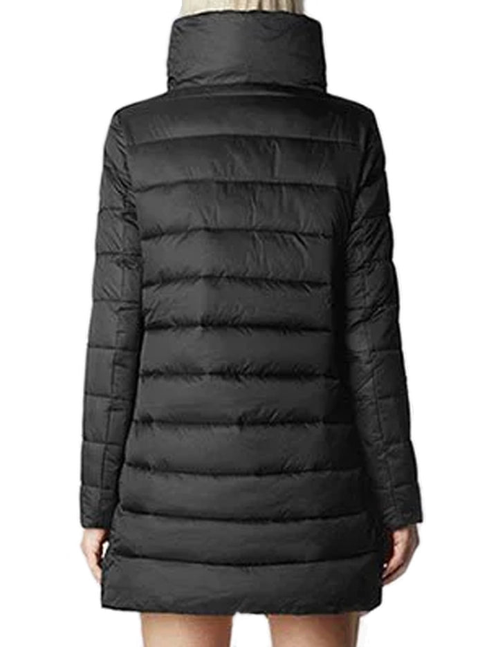 Piumino leggero e idrorepellente in nylon color nero, imbottito con piume di origine animale, silhouette lunga e sottile che si chiude con una cerniera frontale.