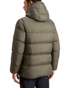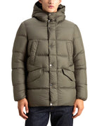Piumino realizzato in microfibra color verde militare, imbottito in piuma d'anatra 90/10 e chiusura con zip nascosta e bottoni a pressione. Cappuccio regolabile con coulisse e visiera, tasche a filetto sul petto con bottoni a pressione nascosti e tasche con patta con bottoni a pressione nascosti. Coulisse interna sul fondo e logo stampato sulla parte anteriore del cappuccio.