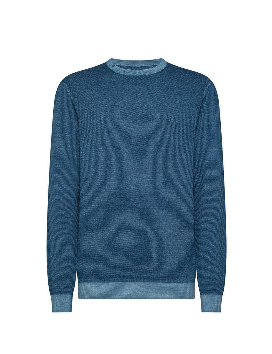 Maglia girocollo in filato di lana effetto vintage color blu avio con lavorazione punto riso. Collo, polsi e fondo a contrasto rifiniti a costina e logo ricamato con filo in tono sul petto.