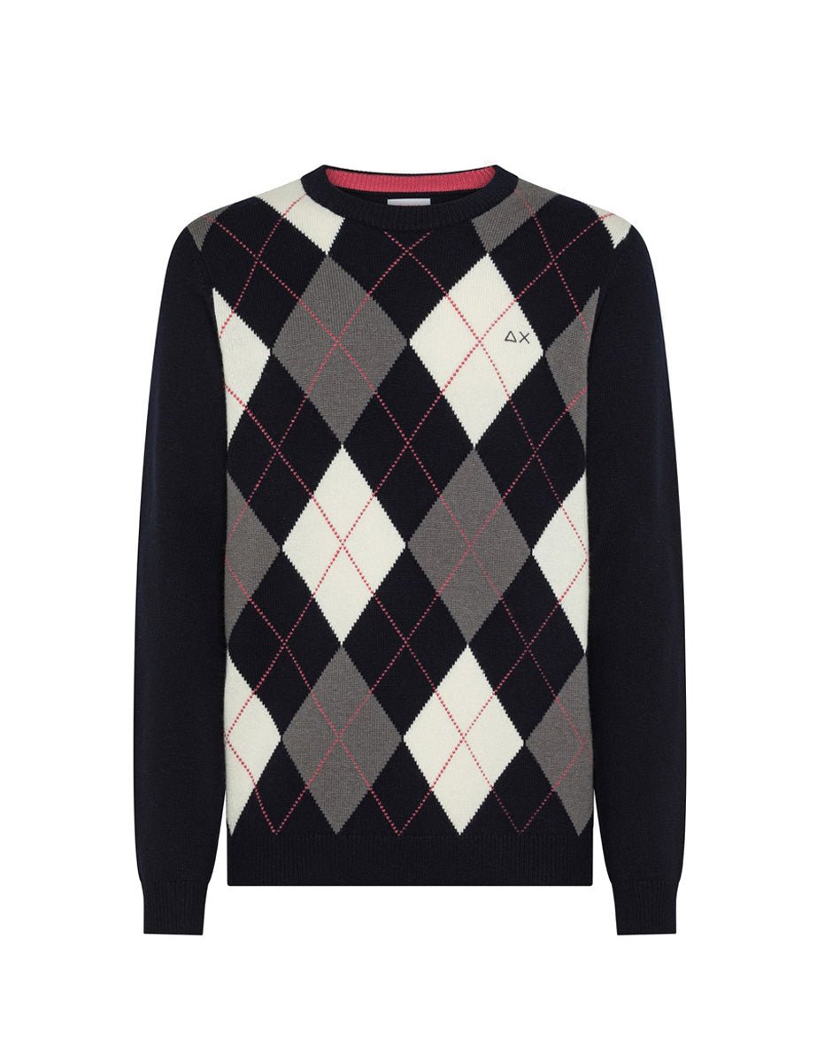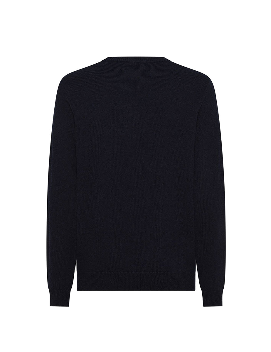 Maglia girocollo in filato di misto lana e cashmere color blu navy con motivo a rombi jacquard frontale a contrasto. Collo, polsi e fondo in costa e logo ricamato sul petto con filo a contrasto.