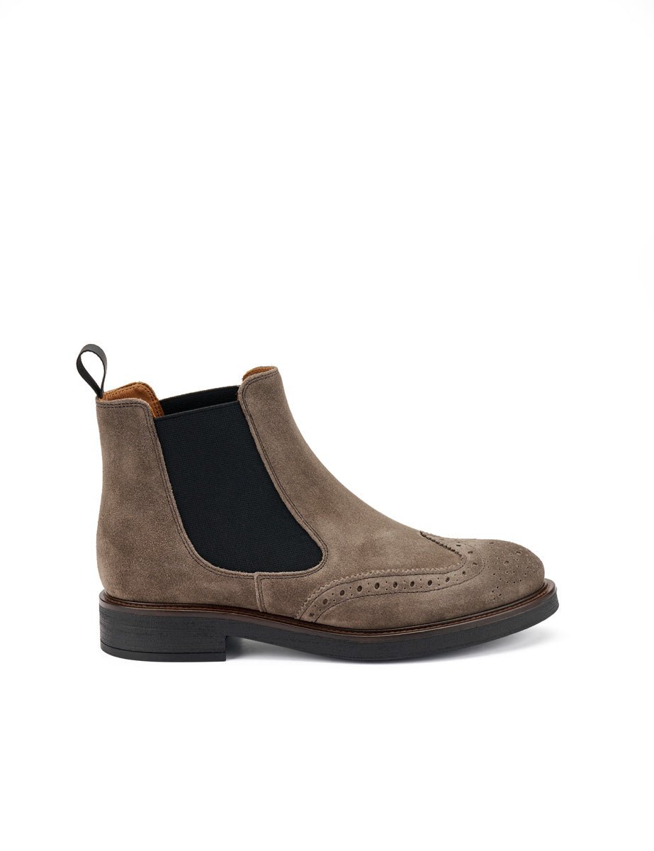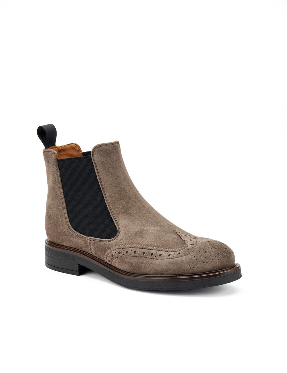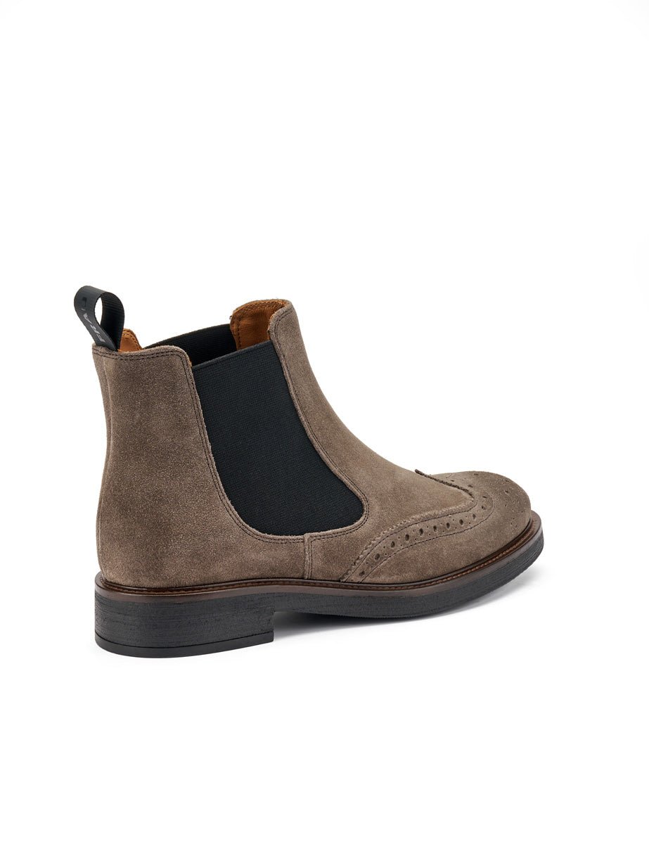 Stivaletto in suede blu navy, pratiche bande elastiche laterali e linguetta portalogo sul tallone. Finitura punta tonda con bucature all'inglese e suola in tono.