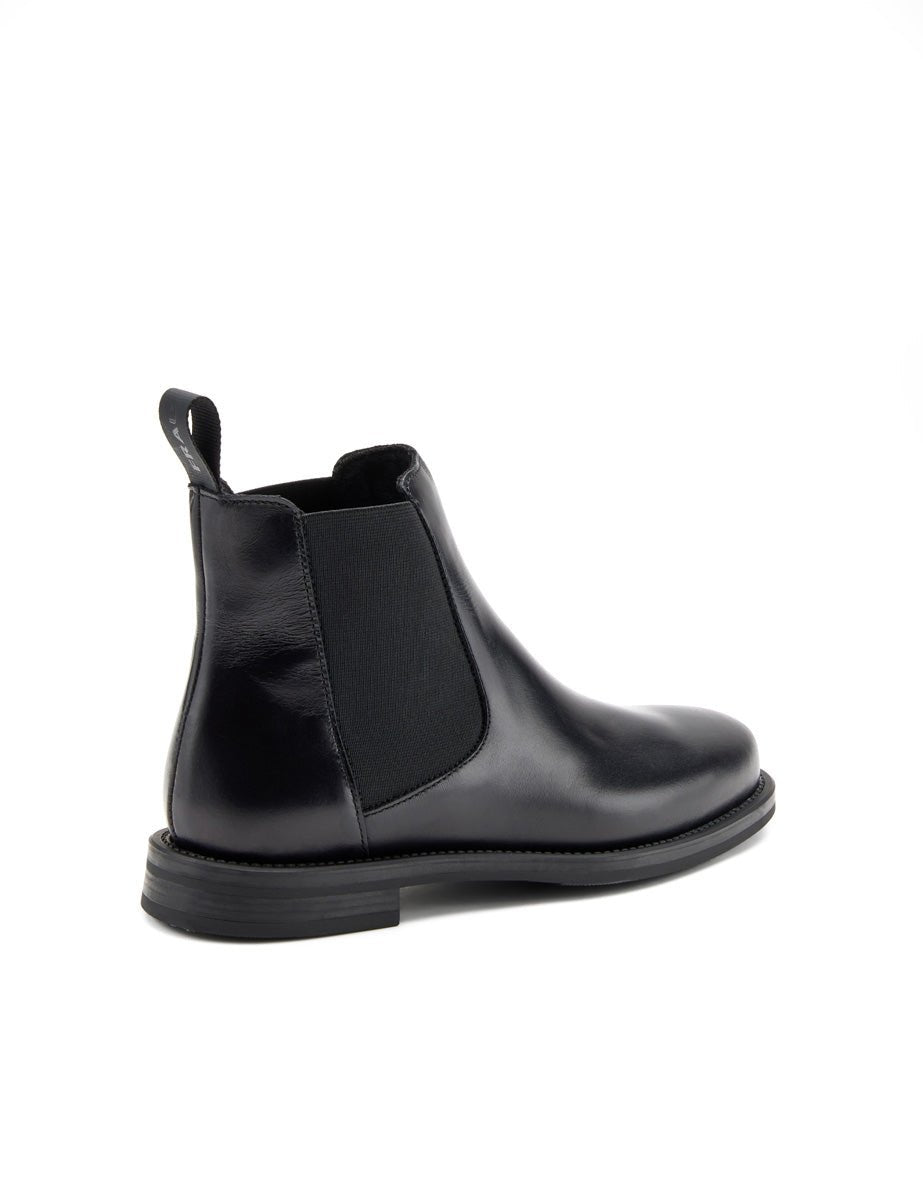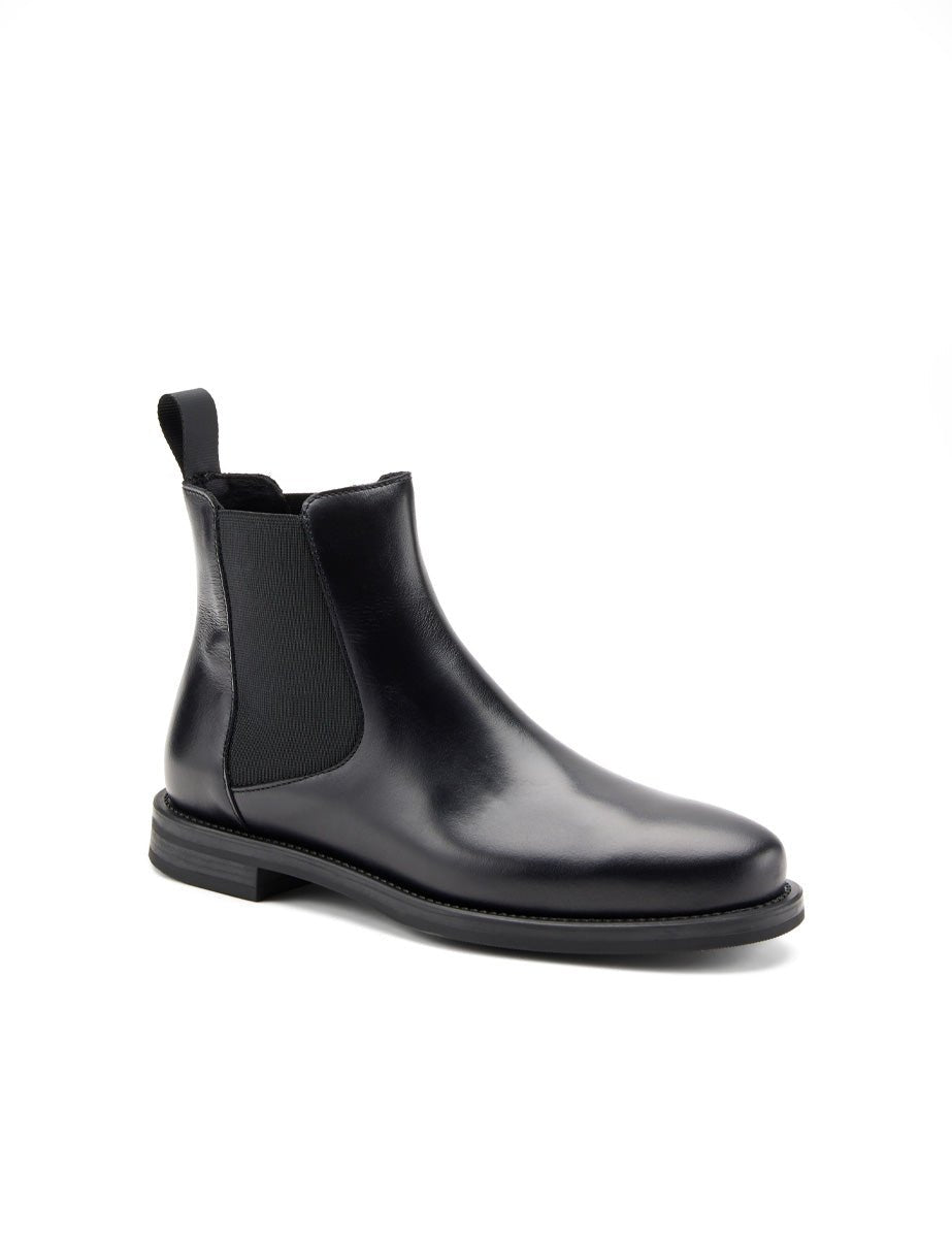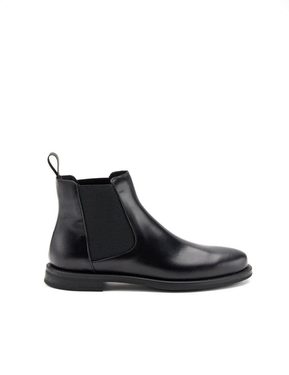 Stivaletto in pelle con finitura lucida, pratiche bande elastiche laterali e linguetta portalogo sul tallone. Punta tonda e suola in tono.
