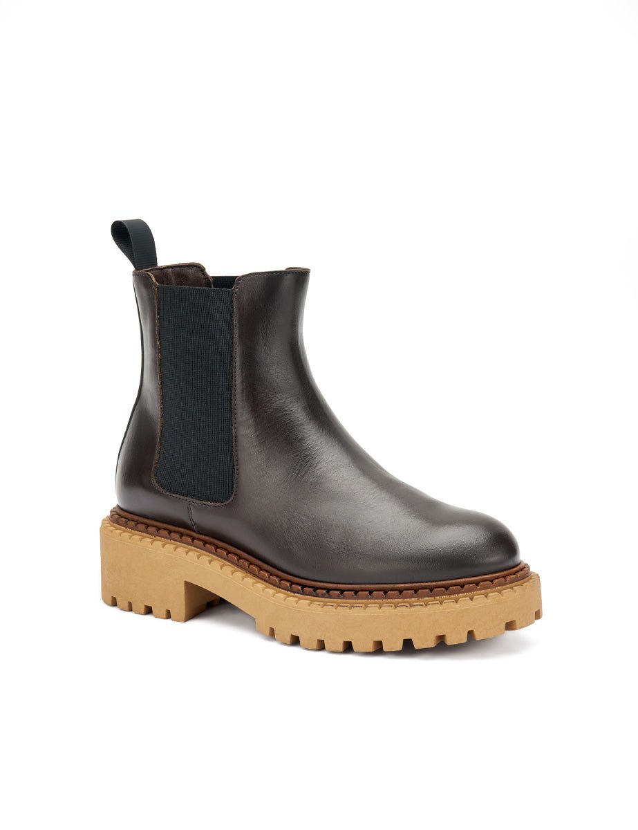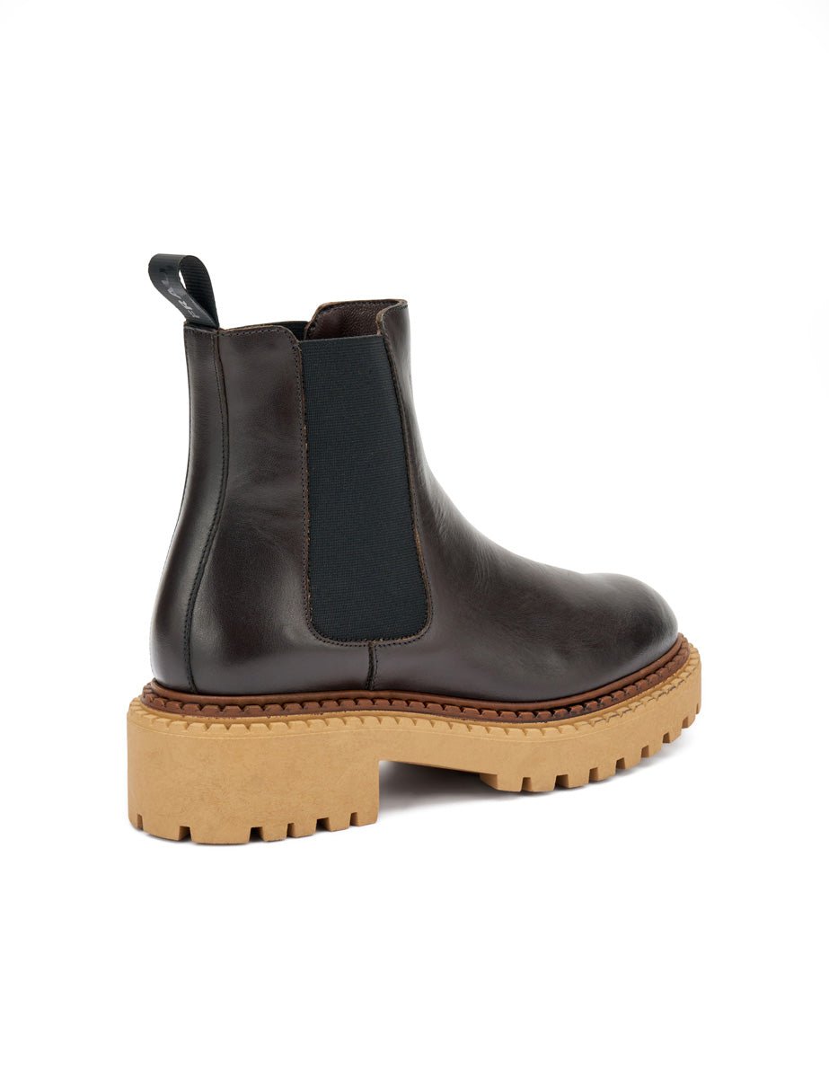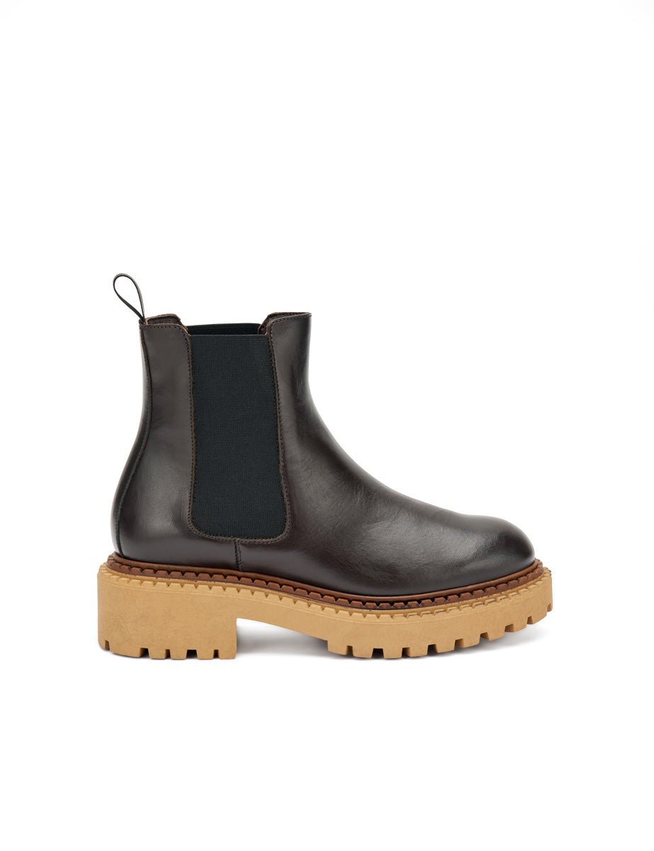Stivaletto in pelle color marrone testa di moro, pratiche bande elastiche laterali nere e linguetta portalogo sul tallone. Punta tonda e suola combact color miele.