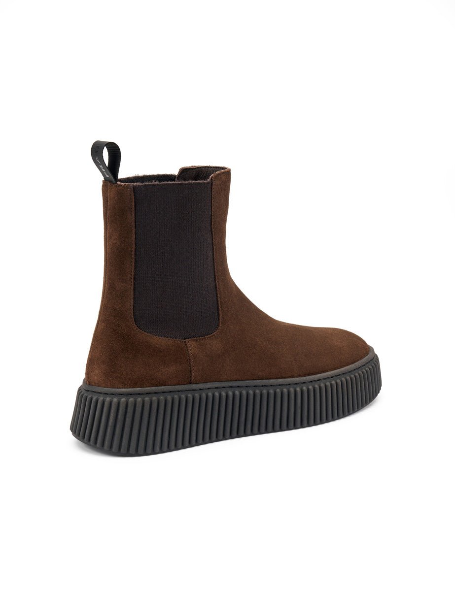 Stivaletto alto in suede color cacao, pratiche bande elastiche laterali e linguetta portalogo sul tallone. Punta tonda e suola flatform scanalata in contrasto.