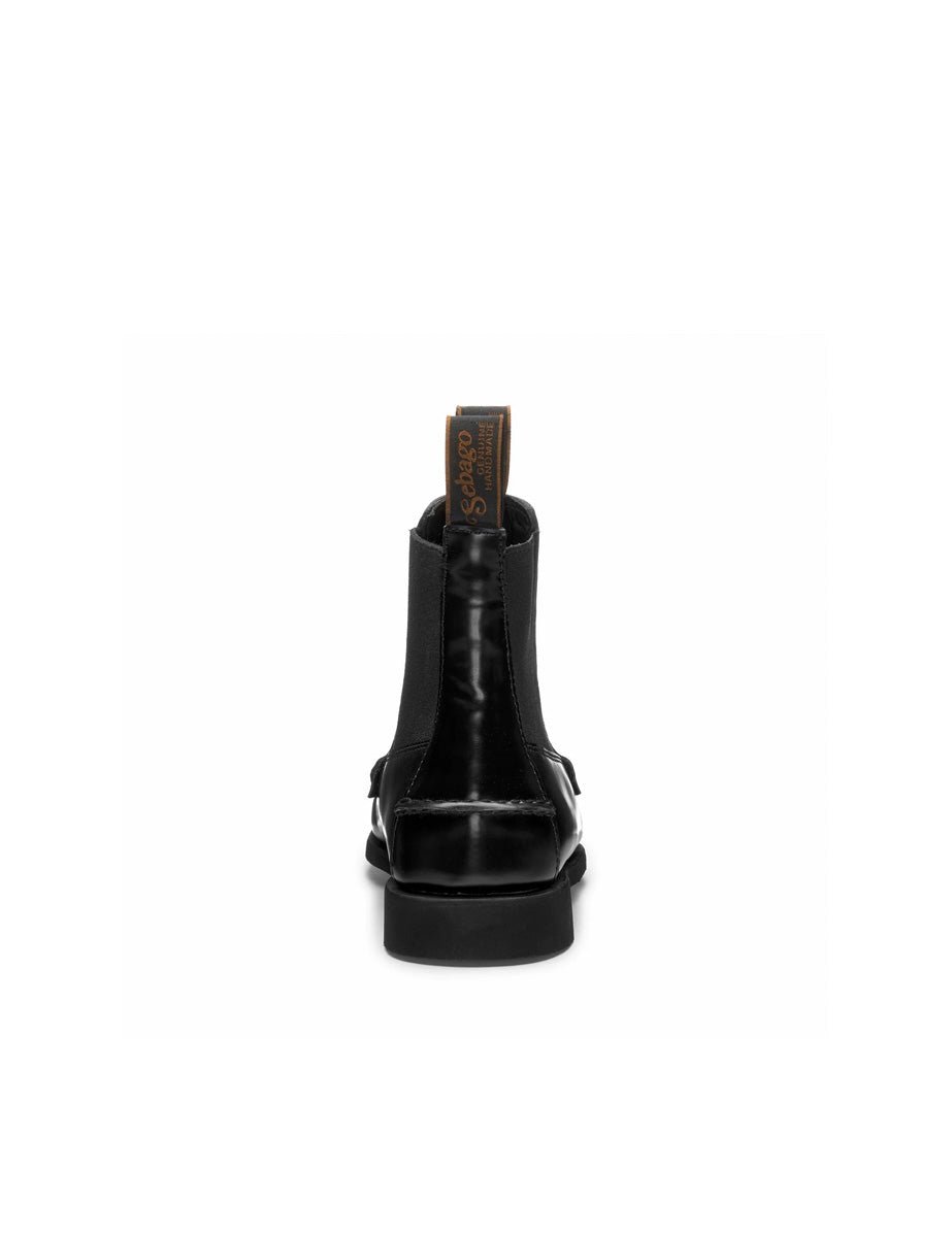 Stivaletto in pelle color nero, pratiche bande elastiche laterali e doppia linguetta portalogo frontale e posteriore. Punta tonda con dettaglio pinzatura con filo in tono e suola in tono.