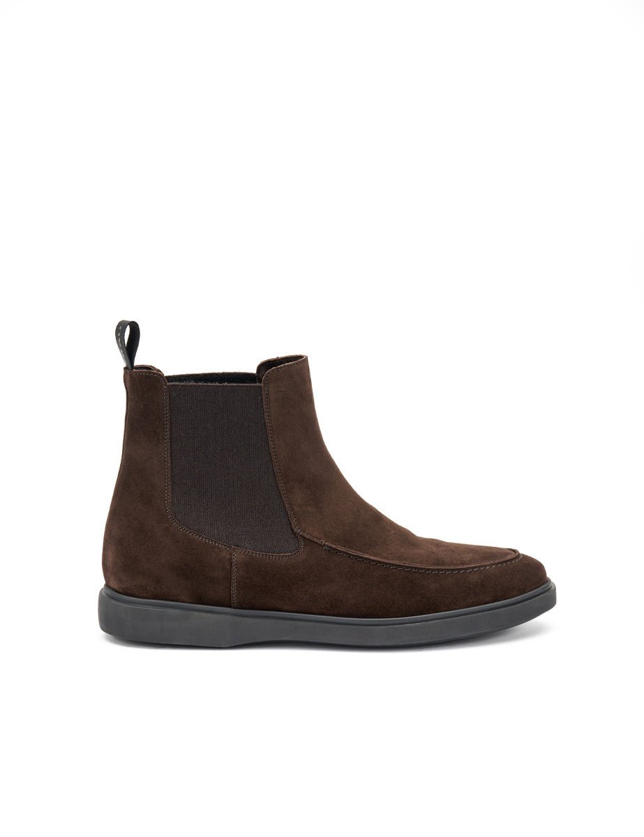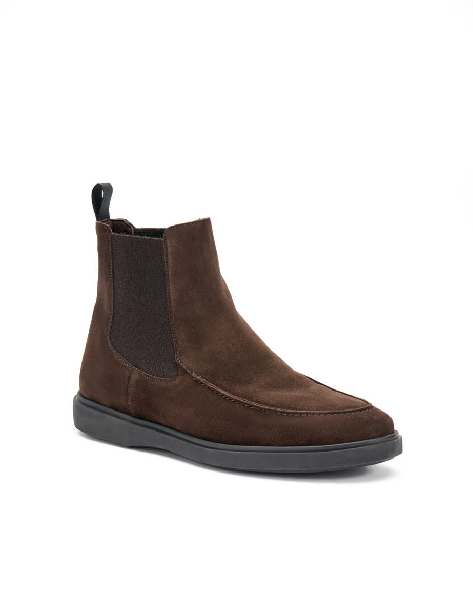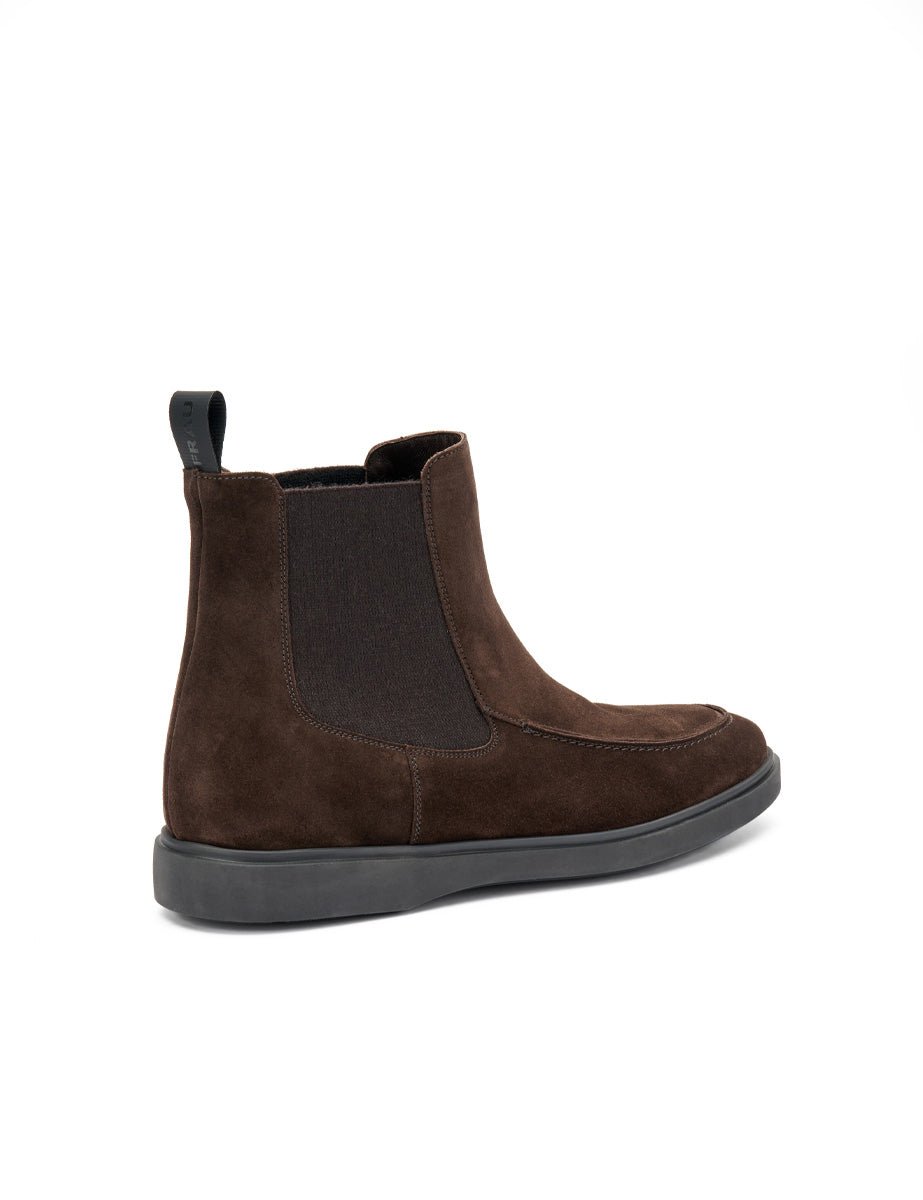 Stivaletto in suede color cioccolato, pratiche bande elastiche laterali e linguetta portalogo sul tallone. Punta tonda con dettaglio pinzatura con filo in tono e suola in tono.