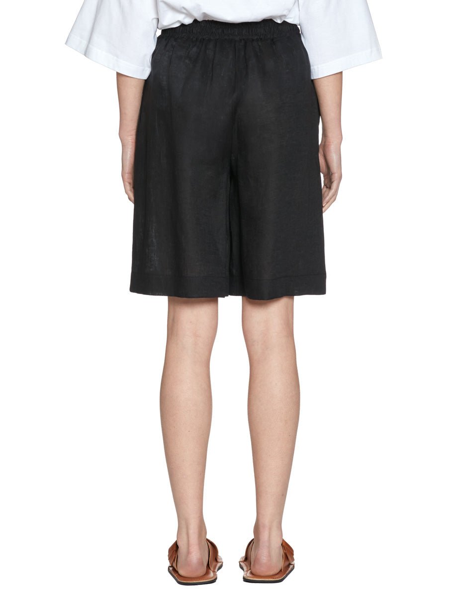 Bermuda in lino color nero, gamba ampia, elastico in vita con coulisse e tasche alla francese.