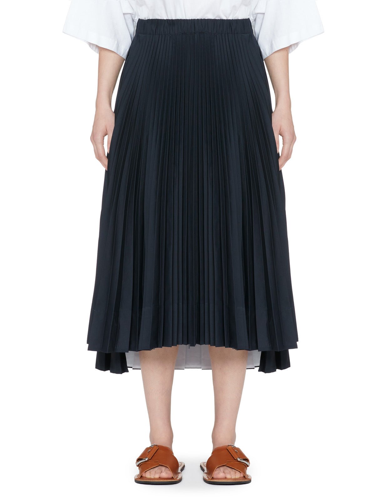 Gonna midi plissettata in tela di cotone color blu oltremare, elastico in vita e orlo al fondo nel dietro più lungo con orlo interno a contrasto bianco.