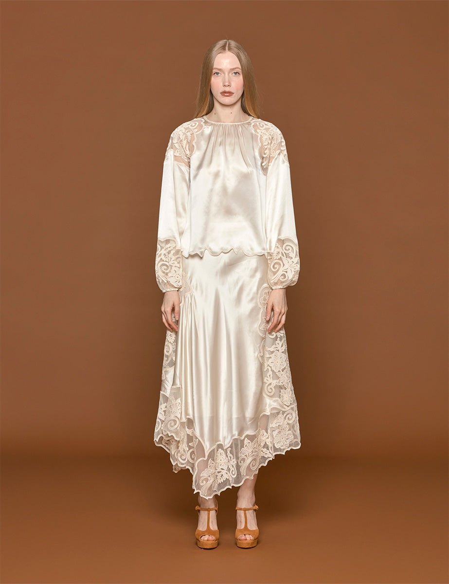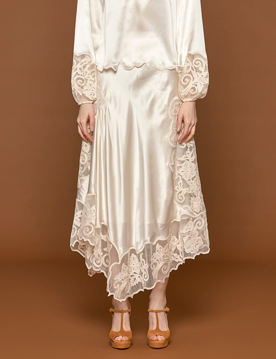 Gonna in raso color latte svasata scivolata, cinturino in vita, chiusura zip invisibile sul fianco e smerlo sul fondo.