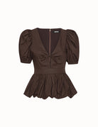 Blusa in tela di cotone color cioccolato, scollo a “V” con motivo nodo e goccia, cintura in vita e motivo fondo a palloncino con arriccio in cintura. Spalla a giro, manica a palloncino con fondo elastico e chiusura sulla schiena con zip invisibile e tirazip portalogo.