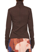 Dolcevita in punto milano color cioccolato, collo alto, volume aderente e manica a guanto. Chiusura posteriore con zip invisibile.