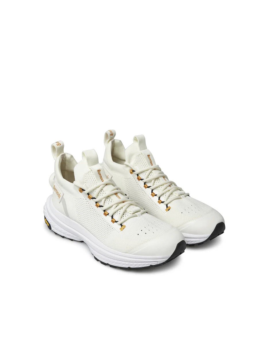 Sneakers in tessuto tecnico bianco, lacci tondi in tono e calzata aderente. Suola in gomma Vibram® e linguetta portalogo al tallone.