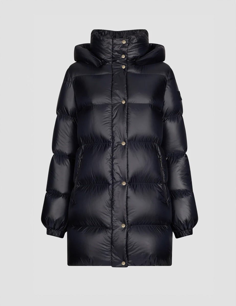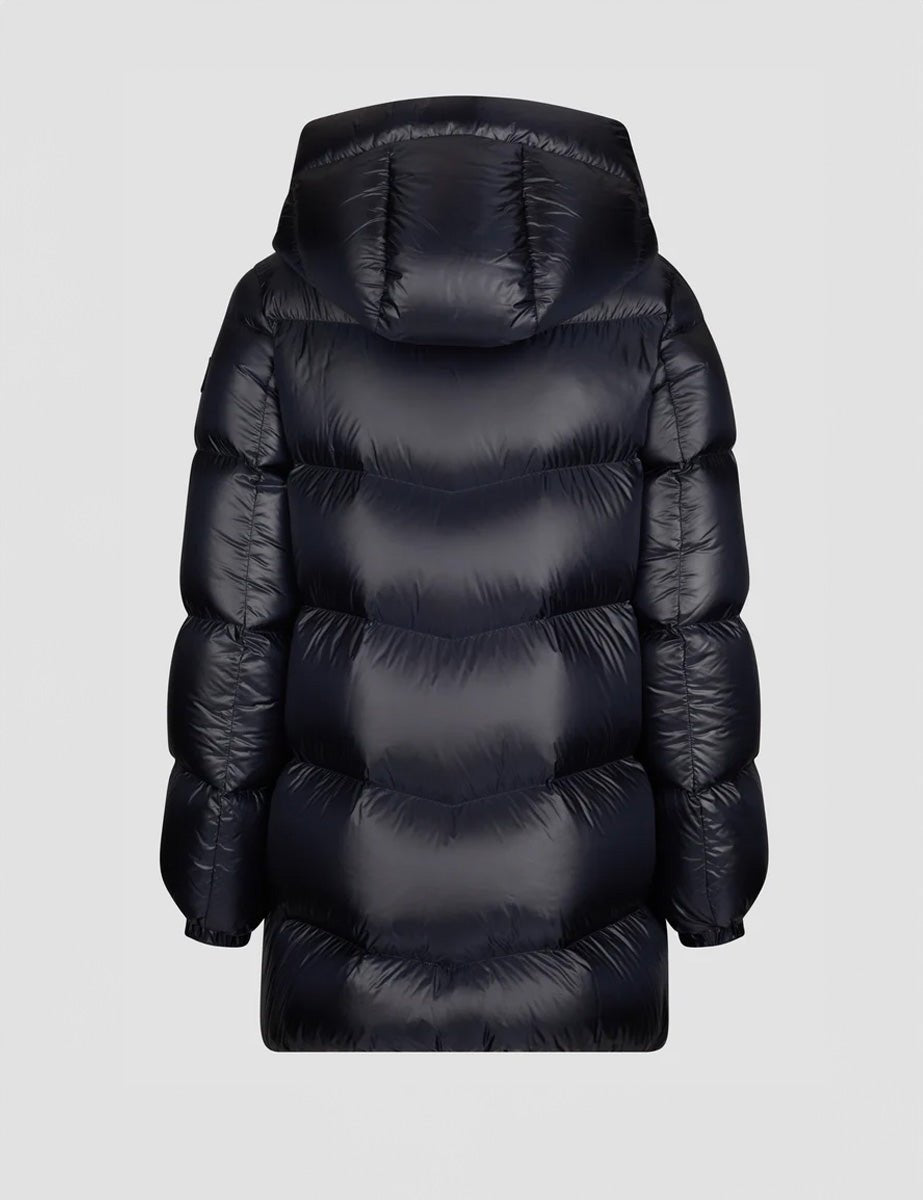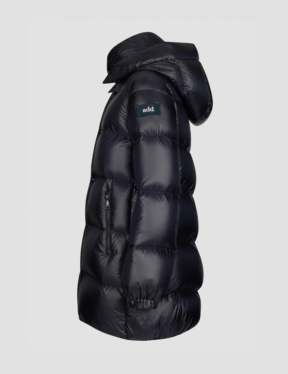 Piumino idrorepellente in nylon lucido nero con imbottitura in vera piuma d’anatra, collo montante con cappuccio removibile con zip e impuntura budelli orizzontali. Patch in tinta sulla manica sinistra, tasche frontali con zip in tono e polsi con elastico antivento a vista, chiusura frontale con automatici metallici.