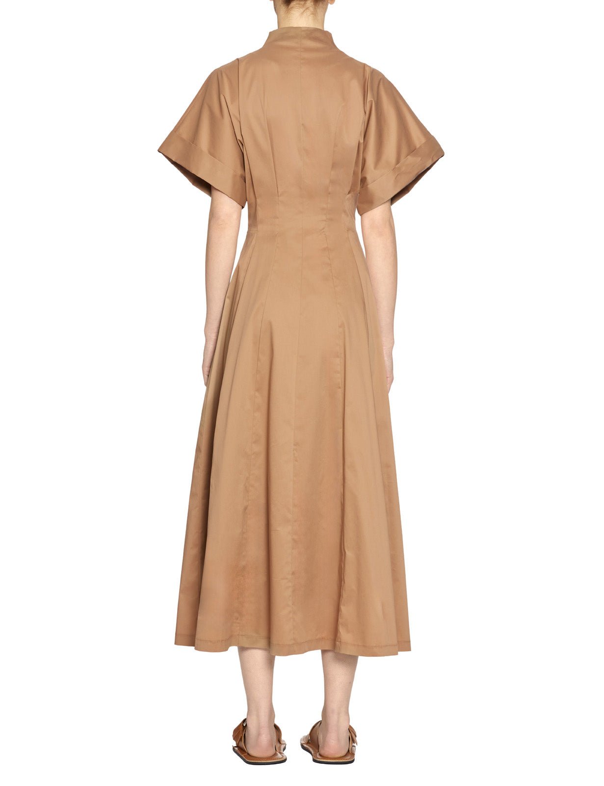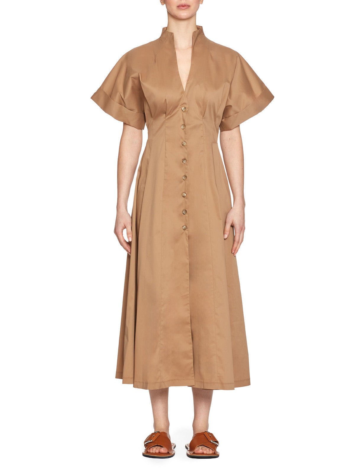 Abito midi in popeline di cotone color biscotto, collo montante e abbottonatura frontale con bottoni in simil corno lucido. Manica corta svasata con risvolto, spalla a kimono, vita aderente segnata da pinces e gonna svasata