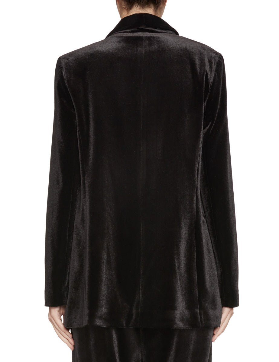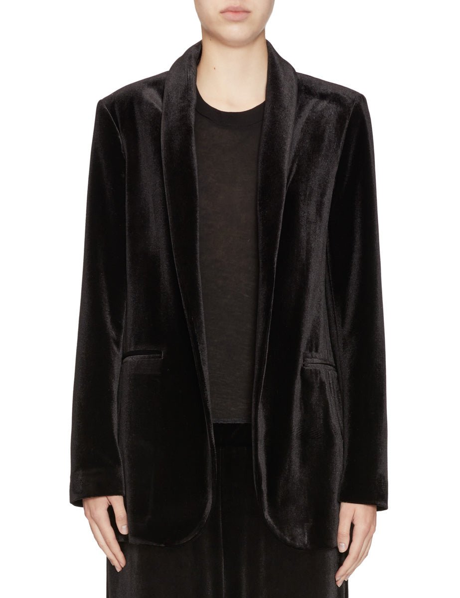 Giacca in velluto liscio color nero, collo a scialle, spalline, tasche a doppio filetto frontali. Volume sganciato.