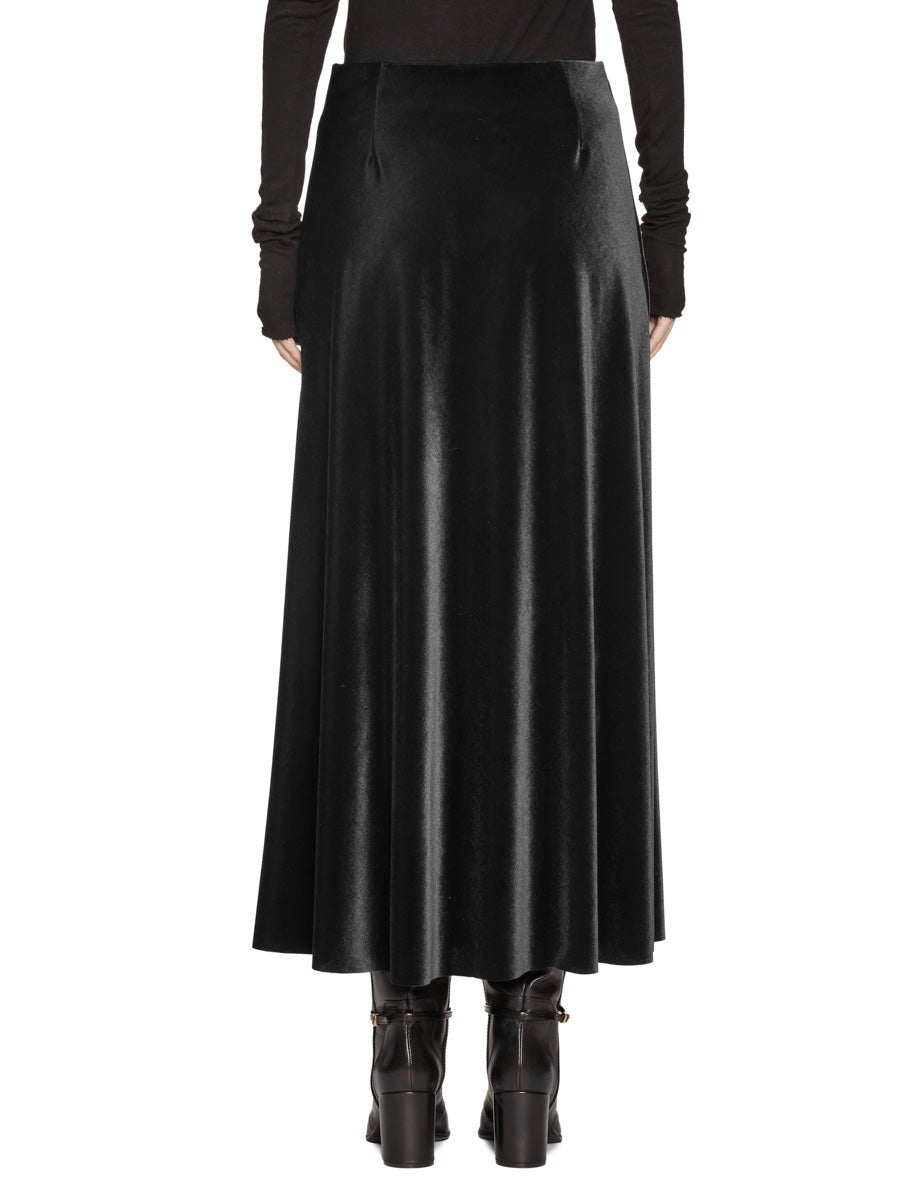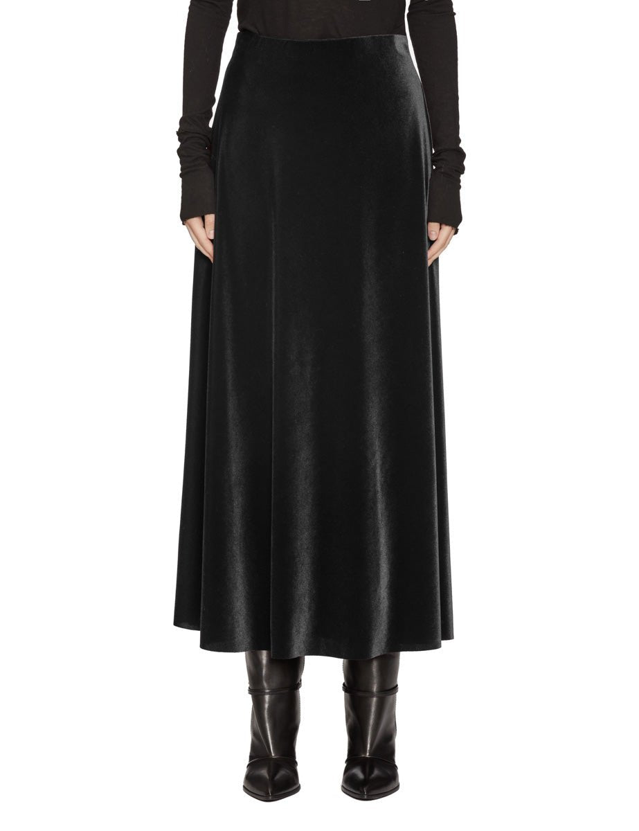 Gonna midi svasata in velluto liscio color nero linea dritta, elastico interno in vita.