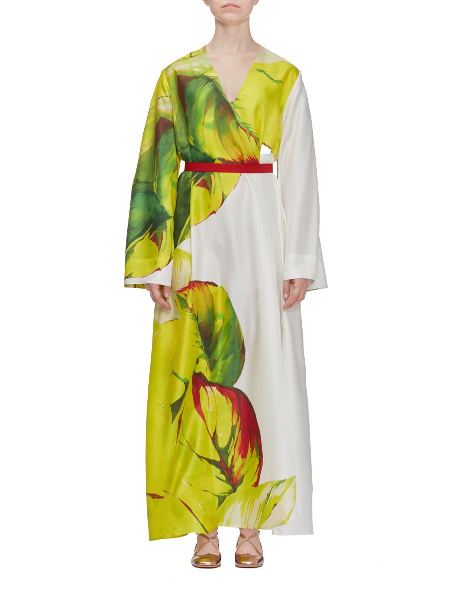 Abito/tunica ad "A" in seta stampa foglia oversize verde su fondo bianco, scollo a “V”, manica lunga svasata e cinturina in gros grain rosso regolabile con ganci nascosti.