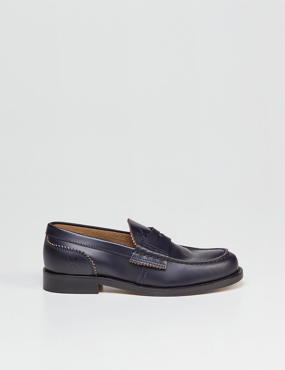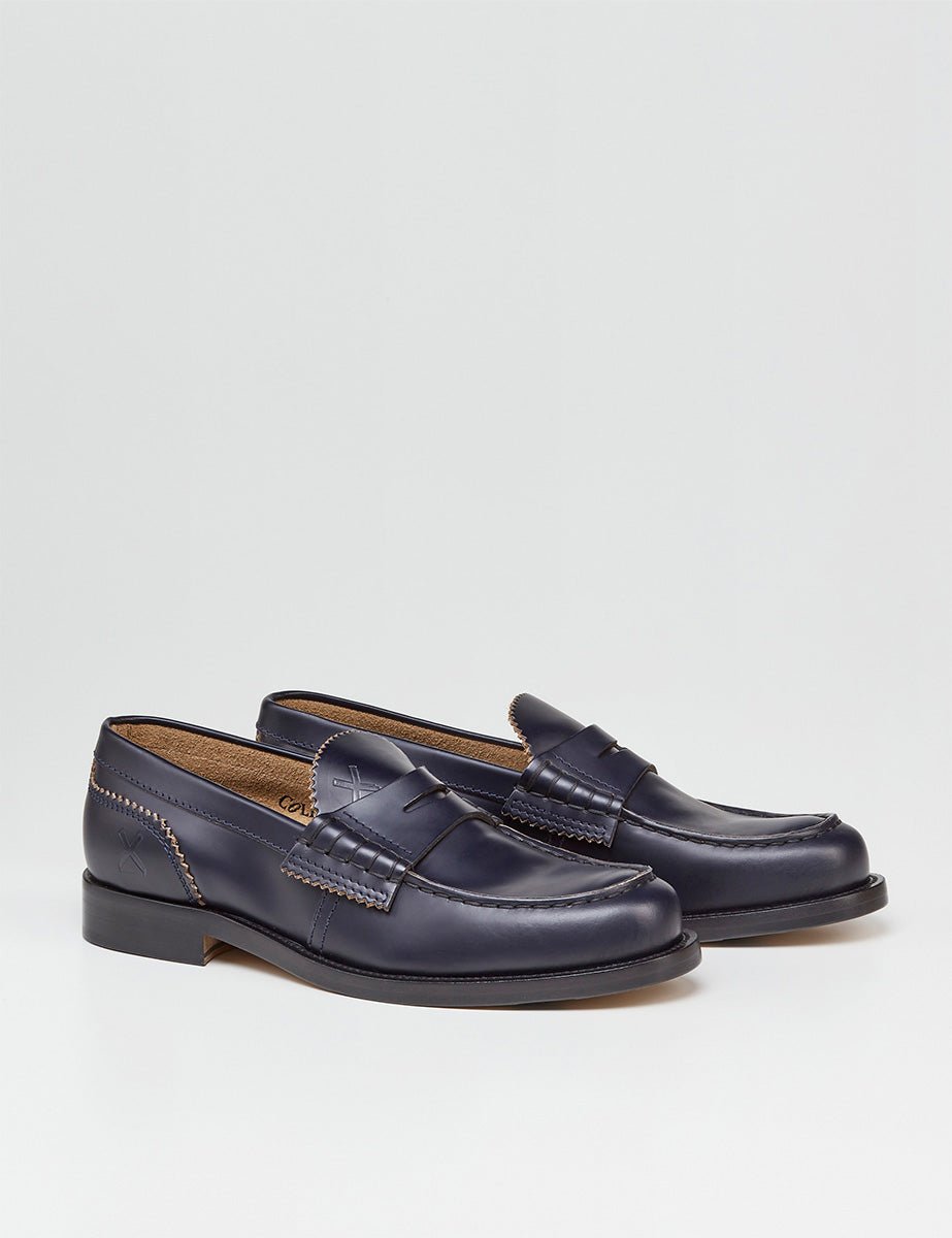 Mocassino con tomaia in vera pelle spazzolata blu night e suola in cuoio. Punta tonda e vaschetta cucita a mano.
