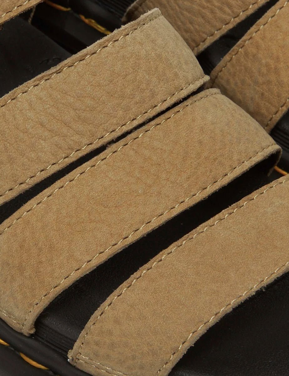 Sandalo in pelle nabuk bottalata beige savannah tan, quattro cinturini e chiusura cinturino con fibbia regolabile alla caviglia, suola leggera Zebrilus con cuciture a vista gialle a contrasto e caratteristica linguetta gialla e nera sul tallone tipica di Dr Martens, punta tonda aperta.