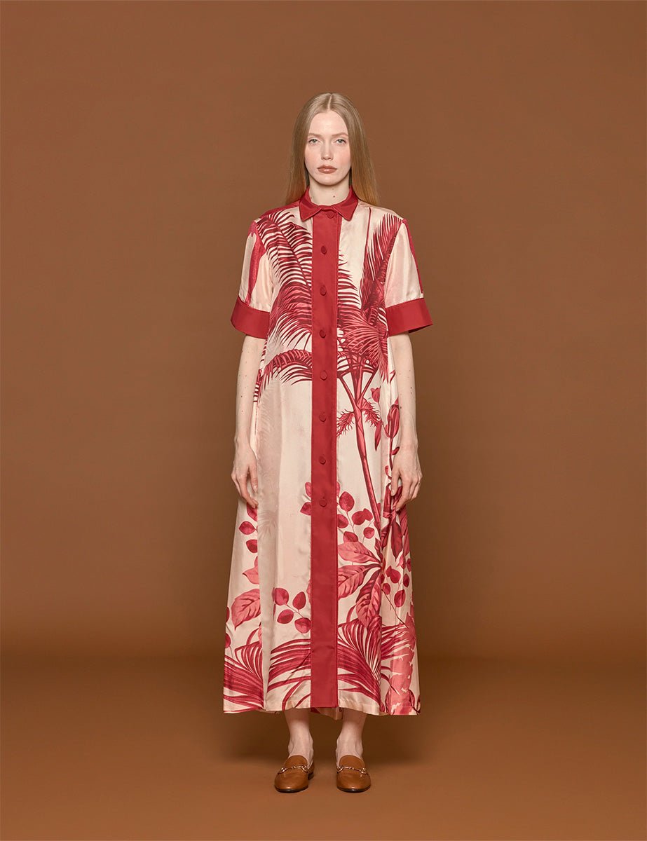 Abito lungo chemisier in raso, stampa piazzata tropicale bordeaux su fondo crema. Manica corta con bordo a contrasto, colletto stondato, finta con bottoni ricoperti a contrasto e sfondo piega sul retro.
