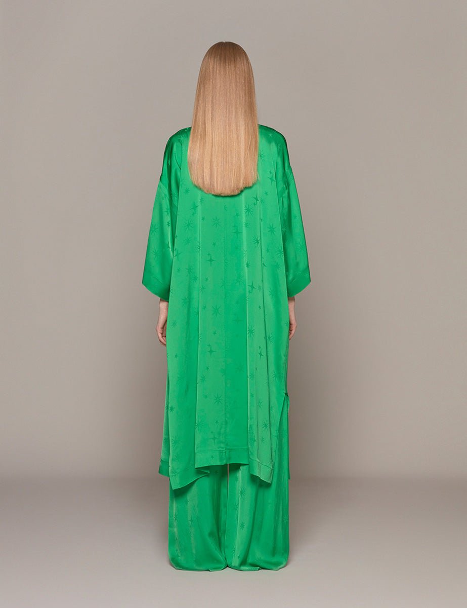 Kimono verde bandiera in raso operato fit fluido, con buco tassello, disegno stelle all over, sottomanica e spacco squadrato sui fianchi.