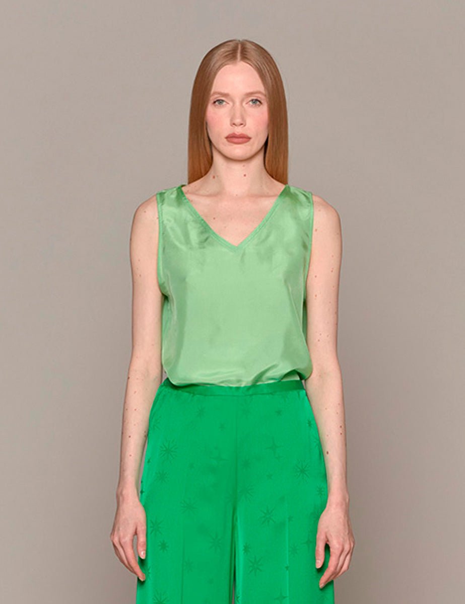 Canotta verde pisello in raso, fit rilassato, smanicata e scollo a V.