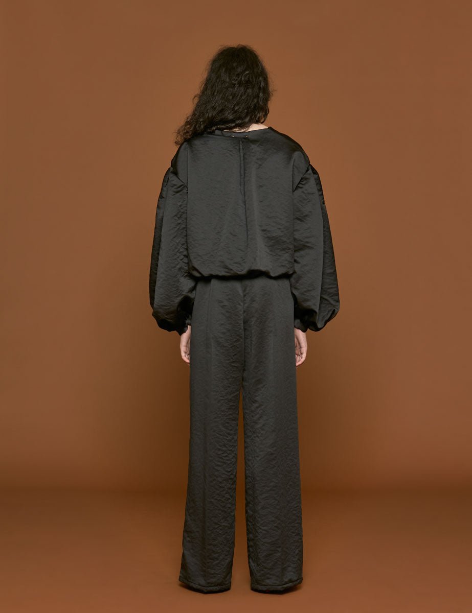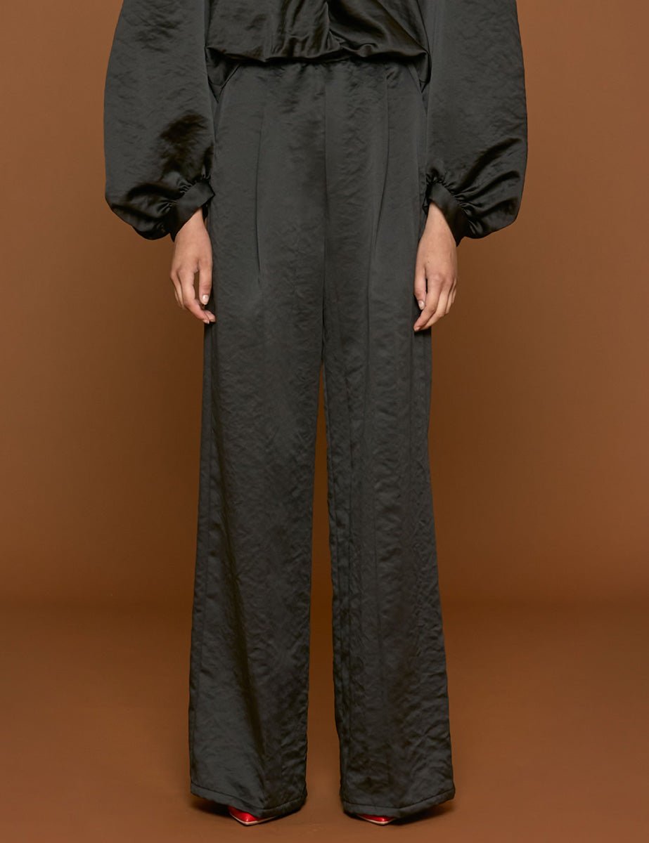 Pantapalazzo elasticato nero in duchesse, una prence davanti, tasche alla francese sul davanti e chiusura zip sul fianco.