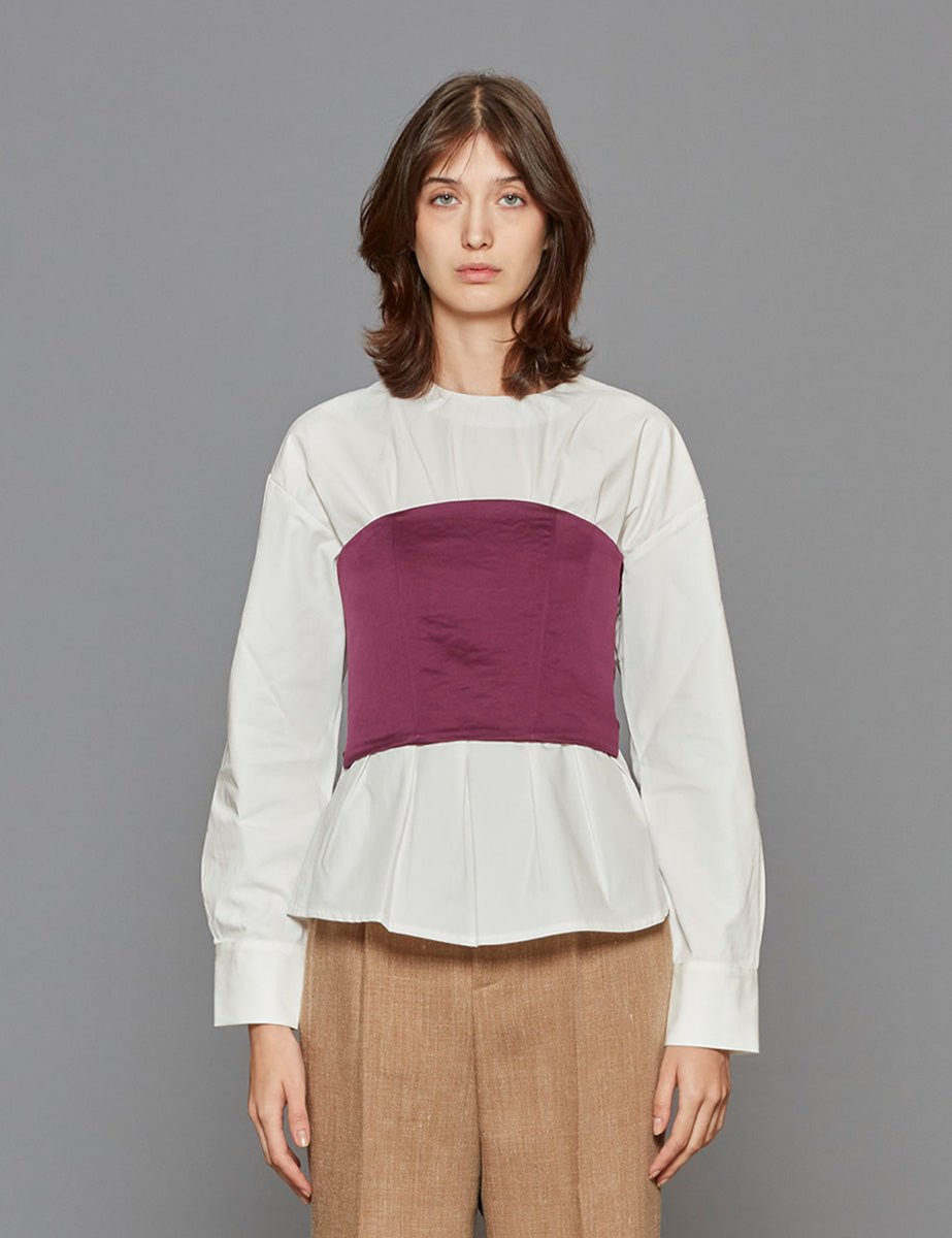 Bustier in duchesse color melanzana, scollo dritto sorretto da stecche interne e retro con fusciacca da stringere in un fiocco.