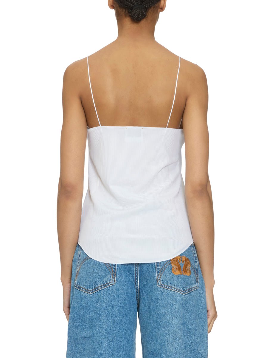 Canotta in viscosa a costine bianca, spalline a codina di topo in cordonetto lucido in tono e finitura a frollino lungo i bordi. Volume al fondo stondato davanti e dietro.