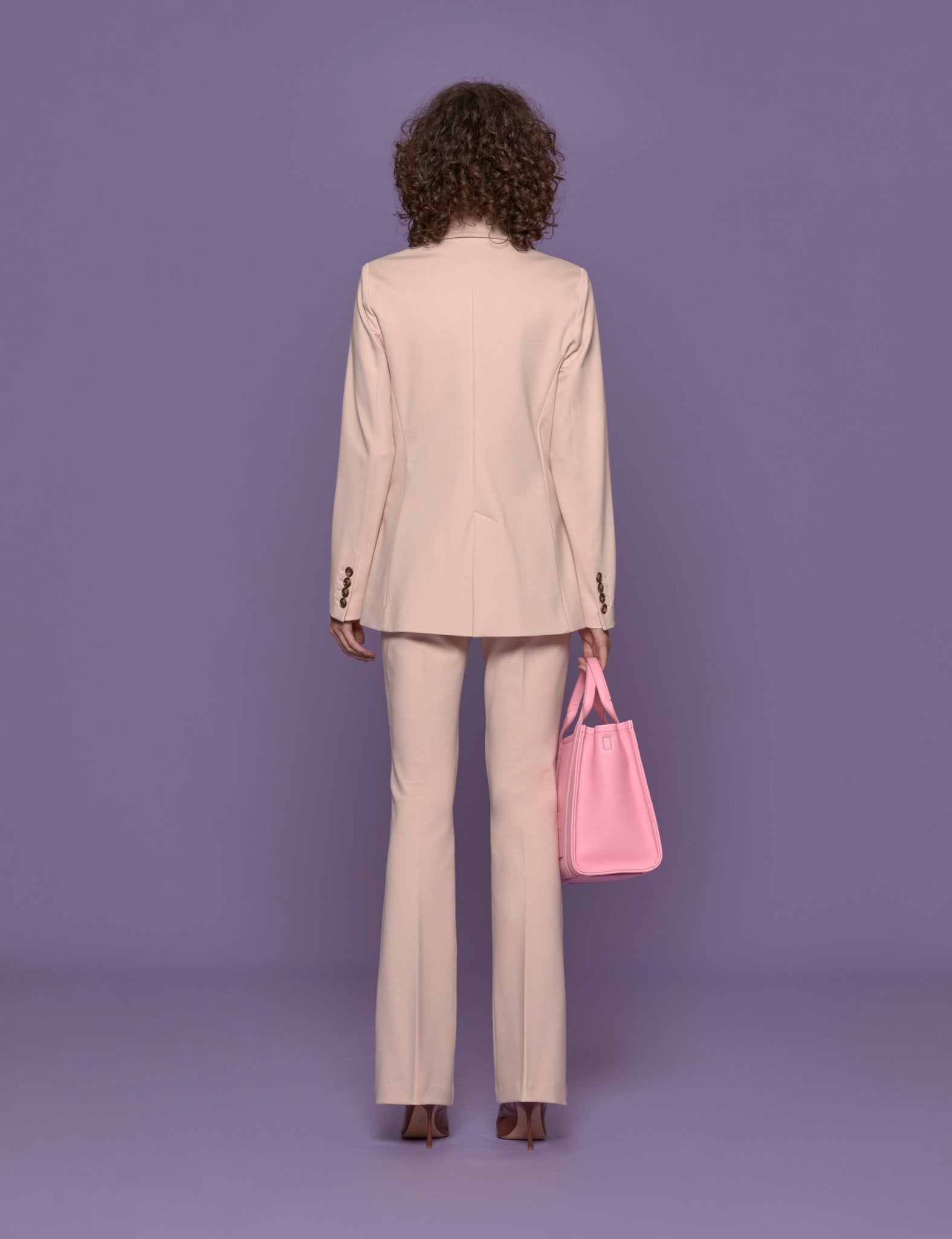 Blazer doppiopetto in viscosa beige. Presenta collo e rever a punta, taschini con patta, taschino superiore e chiusura a sei bottoni.