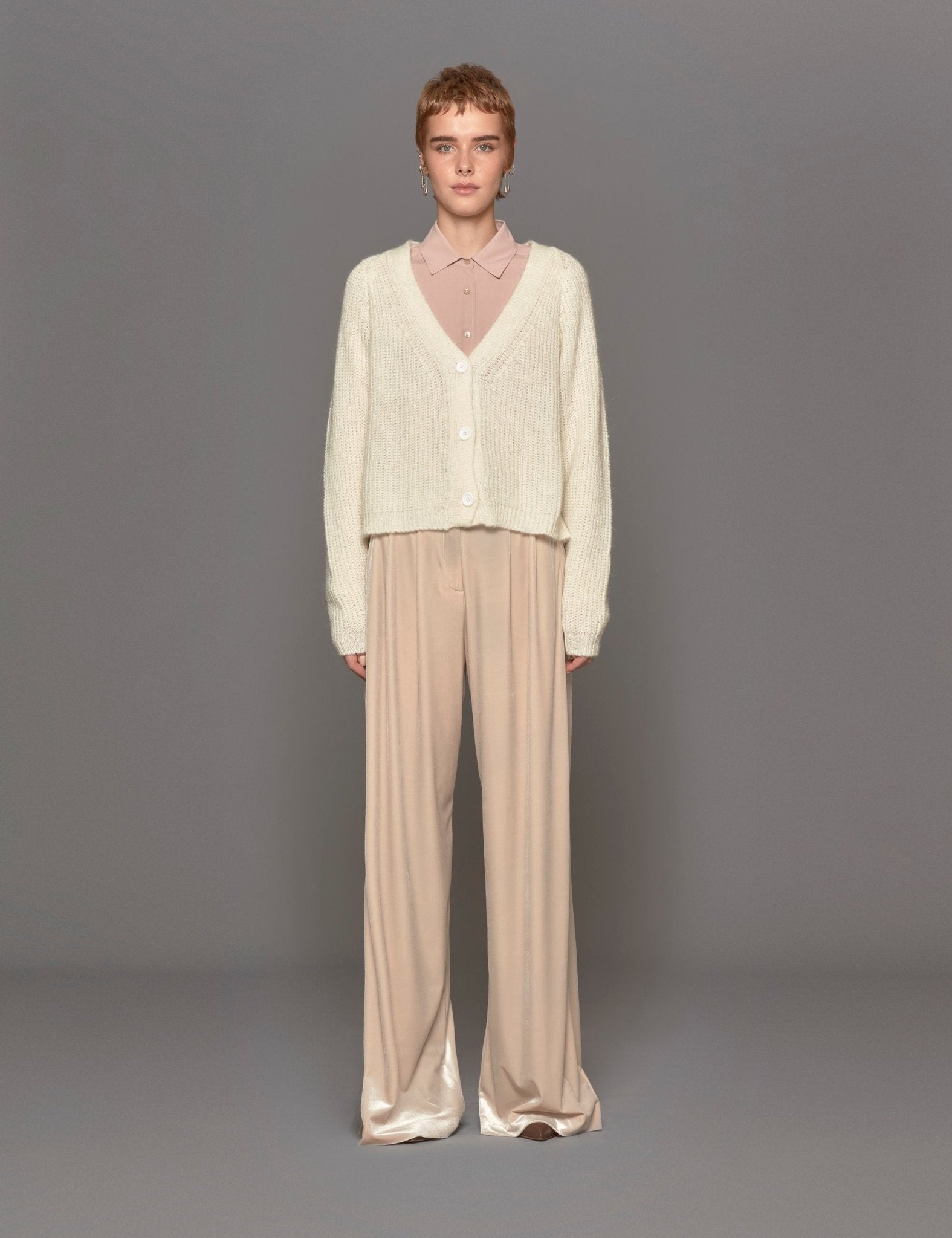 Cardigan in lana panna. Presenta spalla scesa e bottoni sul davanti.
