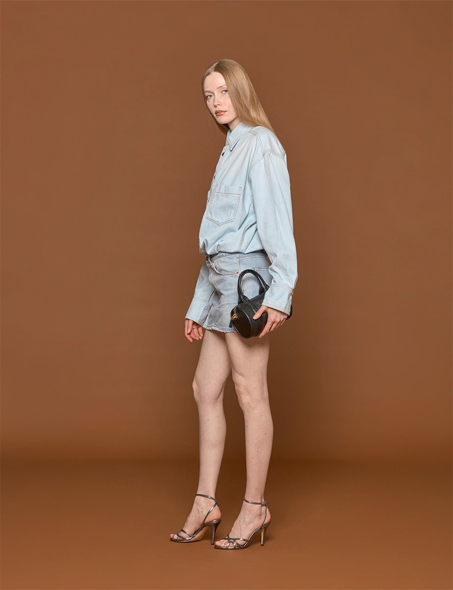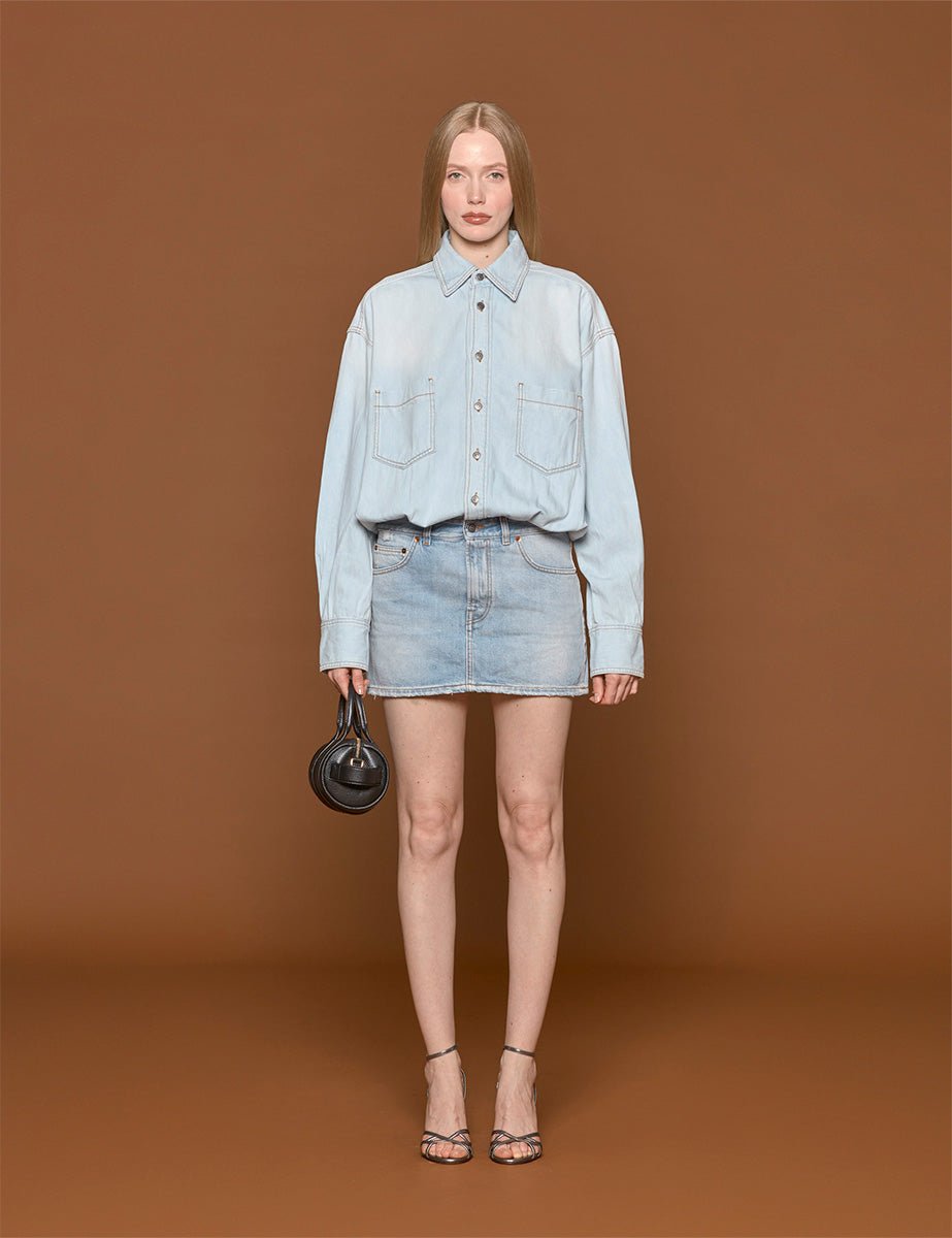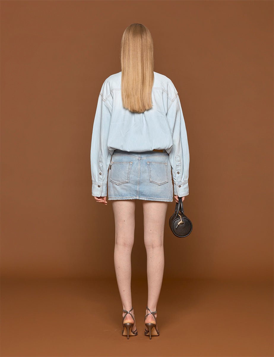 Minidress in denim bleached, composto da camicia over con colletto classico, girocollo largo, manica ampia, polsino chiusura a due bottoni, e minigonna cinque tasche, chiusura a zip e bottone uniti.
