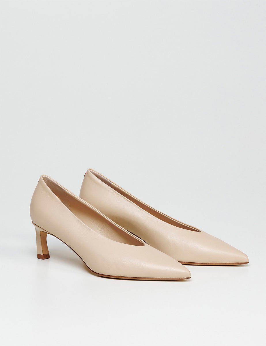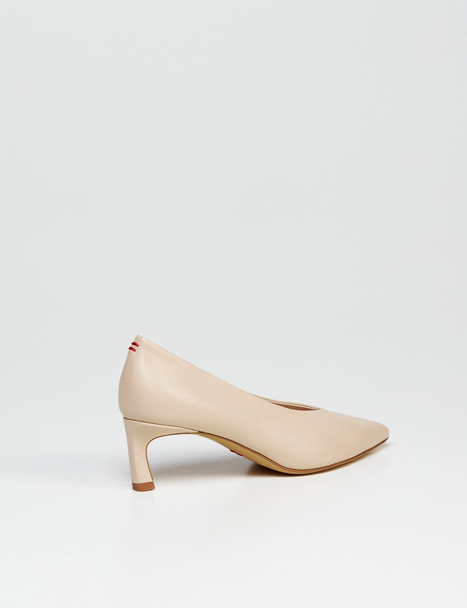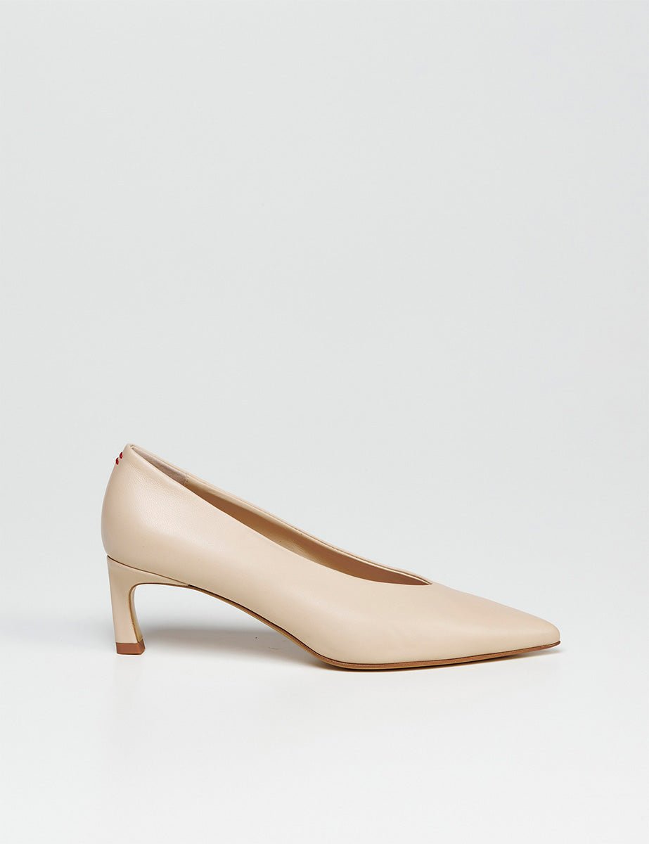 Décolleté a punta in vera pelle bianco sabbia e suola in cuoio e gomma. Tacco a rocchetto rivestito in pelle.