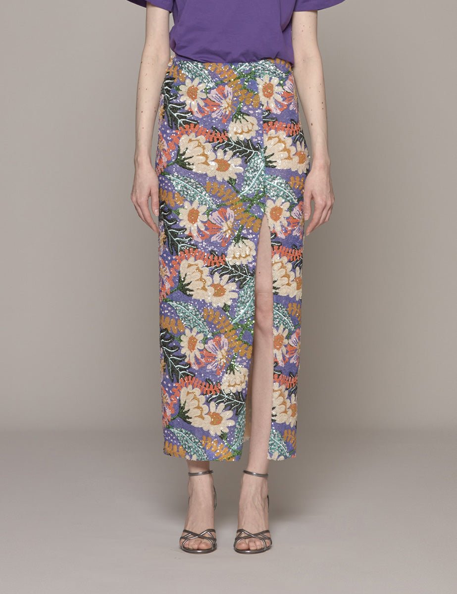 Una gonna elegante e di classe dalla spiccata personalità, una stampa che ricorda i colori della primavera e tante paillettes.